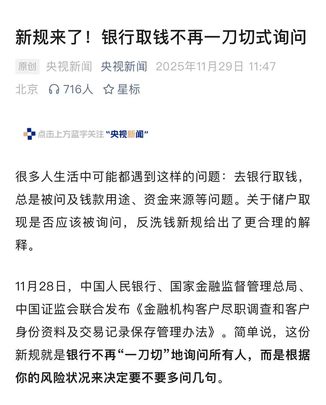 【周筱赟律师胜利了!央行昨晚公布新规,不再一刀切询问!取款超5万不再需要登记!】 银行取现不再一刀切式询问 这就是我一直推崇,并努力身体力行的“通过个案推动制度建设”! 永远不要嘲笑为你争取光亮的人,因为他争取的光也可能照亮你!希望本人@周筱赟律师 努力的一点点微光,能够照亮所有人! @中国建设银行 在此过程中,对我使用了多种下三滥手段,我绝不原谅!全国关注和支持我的银行柜员们,我不会暴露你们,更不会辜负你们的!我还在努力中! 感谢央视、新华社和人民日报这媒体三巨头对“周筱赟律师取款被盘问并被报警事件”的关注和支持!尤其感谢人民日报《反诈,别给群众徒增不便》,一锤定音! 周筱赟律师 2025年11月29日,写于广州 关联阅读:欢迎关注我的头条号“周筱赟律师” 《奇葩!去建设银行山东东营支行取现,我竟被银行报警了》 《周筱赟律师:拒绝建行领导道歉!不投诉柜员而控告领导》 《周筱赟律师致全国各银行柜员们:我不会辜负你们的!》 《周筱赟律师初战告捷?银行内部通知不再一刀切!真的吗》 《绿行不再执行地方加码反诈要求!建行却继续抹黑周律师》 ============================ 周筱赟律师,原网名“落魄书生周筱赟”,原南方周末报系记者、南方都市报评论部首席编辑,后转型为专职律师,专注于经济犯罪辩护。 周筱赟律师,贵州六盘水市“以刑化债案”中女企业家马艺珈伊的刑事辩护律师,全案15人全部无罪不予起诉。 刑事冤案,如果抗争了,还有希望;如果不抗争,就一点希望也没有了。 所谓“周筱赟魔咒”,是网友的总结,即:凡是得罪周筱赟的,要么免职、要么留置、要么判刑、要么家破人亡。当然,所谓“周筱赟魔咒”,全部纯属巧合。 欢迎咨询周筱赟律师本人 ============================