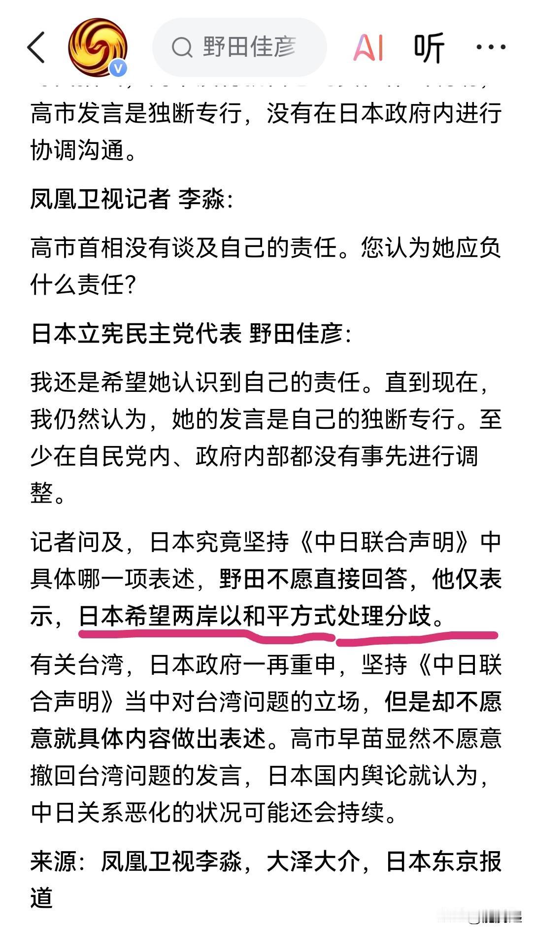高市早苗与野田佳彦是一伙的?凤凰卫视驻东京记者,采访日本前首相、立宪民主党党首野田佳彦:日本究竟坚持《中日联合声明》中的哪一项? 野田佳彦有所回避:仅表示,日本希望两岸以和平方式处理分歧。这一表态,与日本致联合国秘书长古特雷斯的信函,保持高度一致,信中说:“尽管遭到邻国的反对,仍有一些国家继续试图通过武力或胁迫方式单方面改变现状。”这里的“一些国家”,明明指的就是中国。 但是中国的武力,针对的只是台湾岛内的“台独”分裂势力,这显然纯属中国内政。日本反对中国大陆动用武力针对台独分裂势力,就是不希望中国大陆武力统一台湾。但如何解决台湾问题是中国的内政,不容任何外部势力干涉。日本明显就是违反《中日联合声明》中不干涉中国内政的表述。 因此日本违反了自己的庄严的政治承诺,跟美西方搞在一起,反对中国大陆“通过武力或胁迫单方面改变台海现状”,本质上是干涉中国内政,维护美西方的霸权。这是日本右翼的一贯立场。 各位读者你们怎么看? 欢迎大家在评论区讨论! 日本右翼 高市早苗 野田佳彦当选日本最大在野党党首 中国台湾问题 日本的“一贯立场”还能坚持多久 中国必将统一台湾 日本右翼
