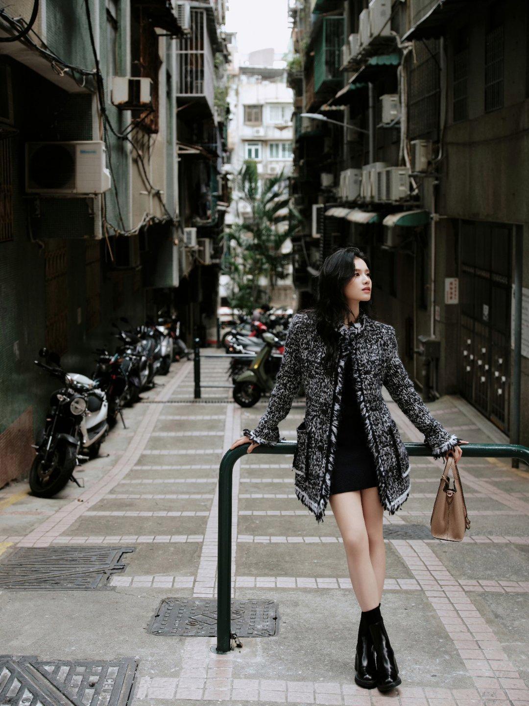 张婧仪毛边流苏裹满衣身,混织纹理自带法式复古质感,宽松版型衬得肩颈线条又美又随性;内搭黑色短裙露腿,甜酷感直接拉满。