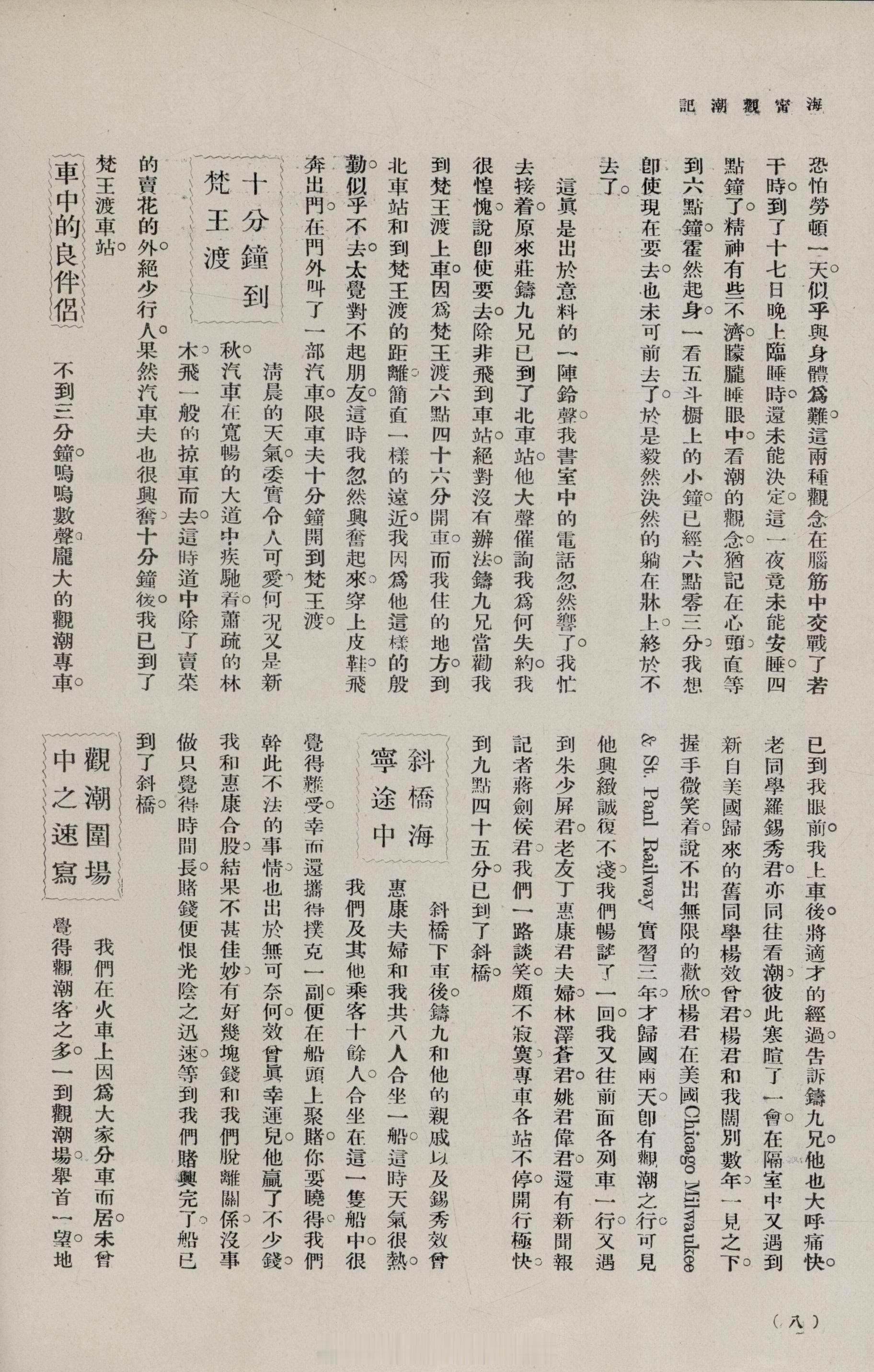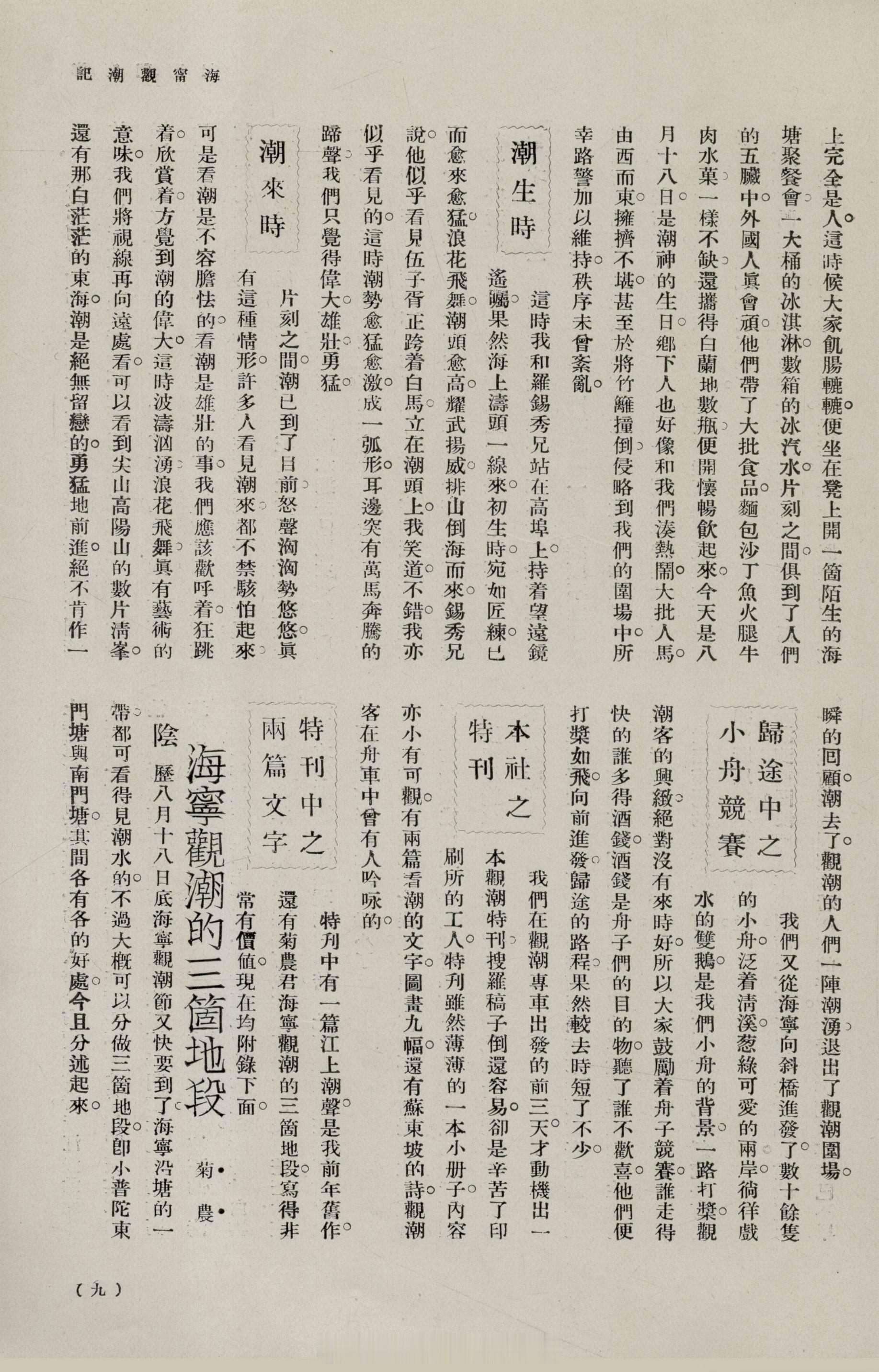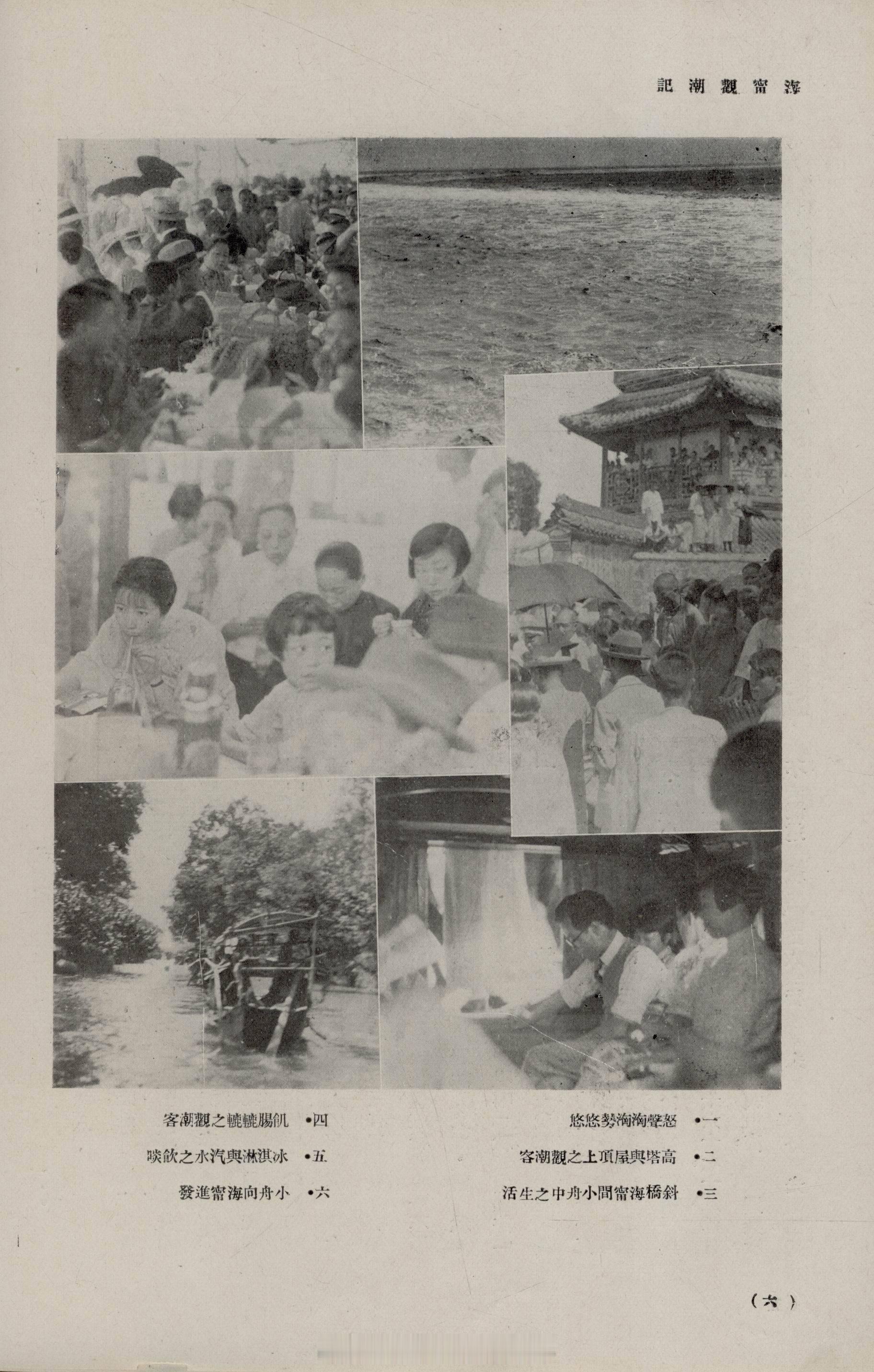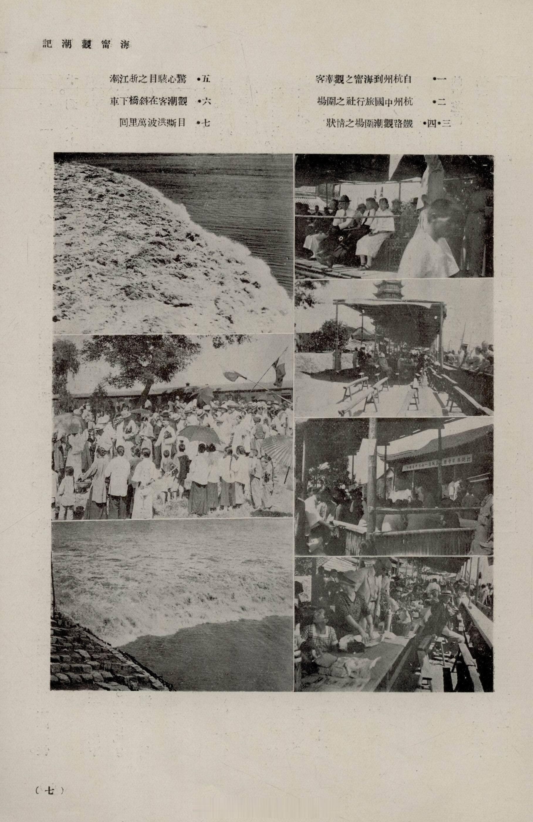 摩登行旅——近代长三角旅游文献展海宁观潮记赵君豪《旅行杂志》1927年第1卷第3期5-12页1927年中国旅行社与铁路局合作,于十六至十八日开设观潮专列。赵君豪斟酌一夜后,决定十八日与庄铸九同赴海宁观潮,并于专车上偶遇罗锡秀、杨效会等老友。当日游客如织,亦有不少外国游客携面包、沙丁鱼、牛肉、水果及白兰地,于潮场中野餐,平添几分异域风情。