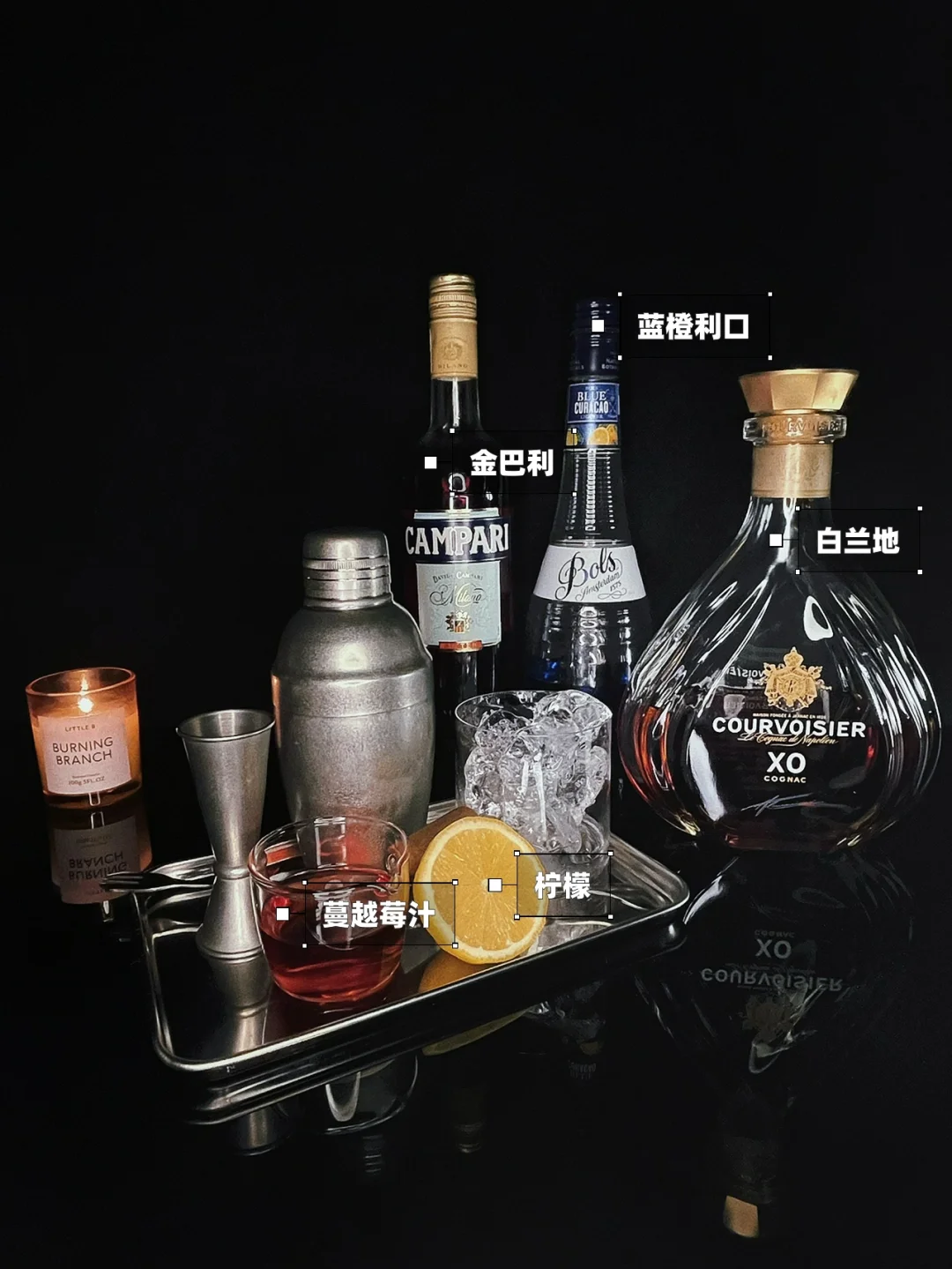 Ps:这款特调基酒用的是COURVOISIER馥华诗XO,有着法式焦糖布丁、糖渍香橙和鸢尾花的幽香,金巴利的苦甜味与蔓越莓、柠檬汁的甜酸调配一起,口感独特、口味惊喜~快来试试