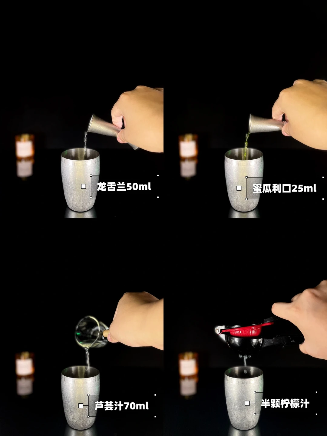 加入50ml龙舌兰、25ml蜜瓜利口、70ml芦荟汁,再挤入半颗柠檬