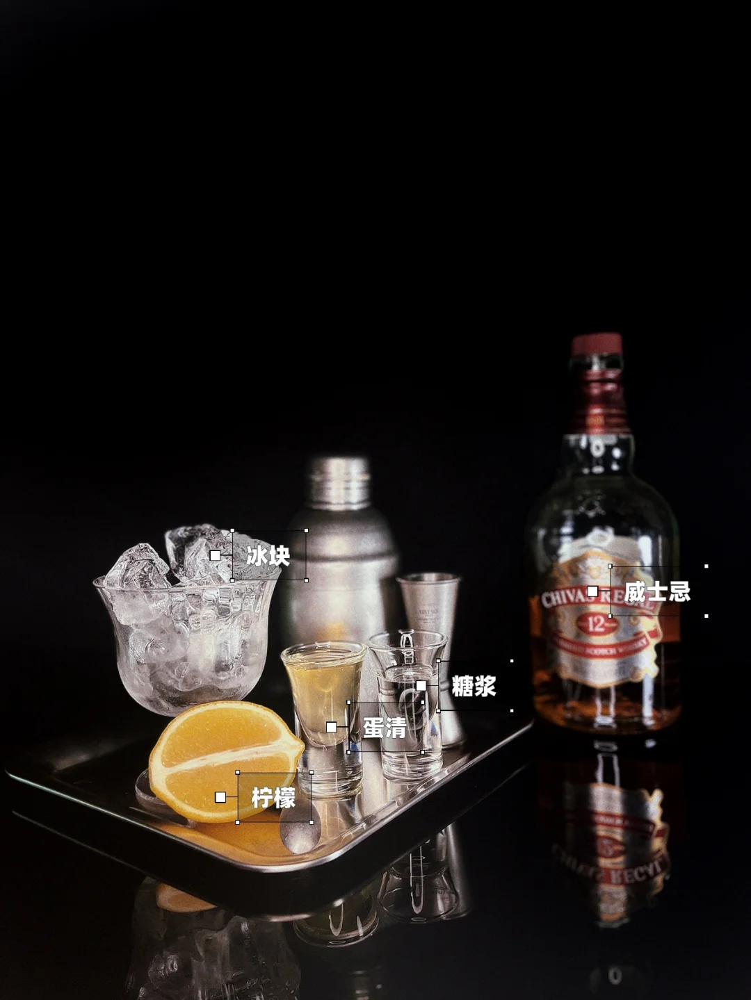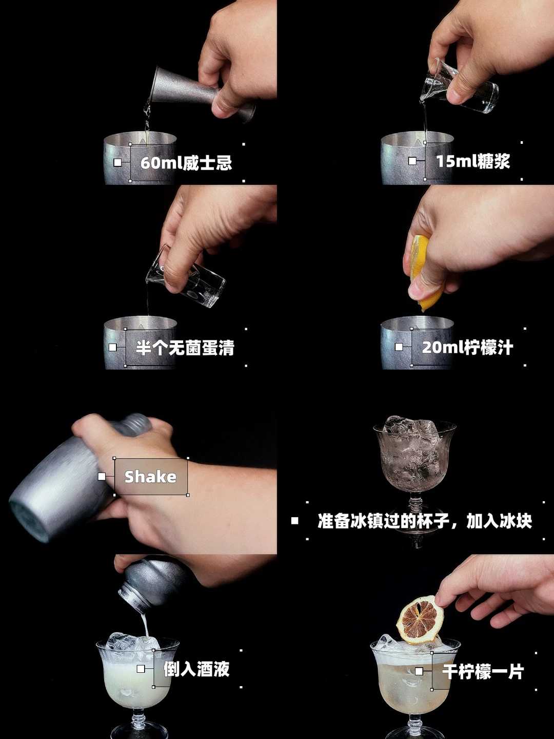 Step 1:Shaker里加入威士忌、柠檬汁、糖浆、半个无菌蛋清、冰块