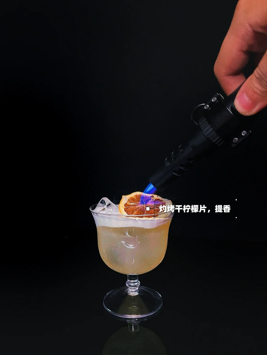 Step 4:壶中倒出酒液,干柠檬装饰,用喷枪灼烧柠檬片使其散发香气提香,完成!