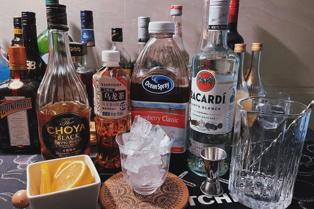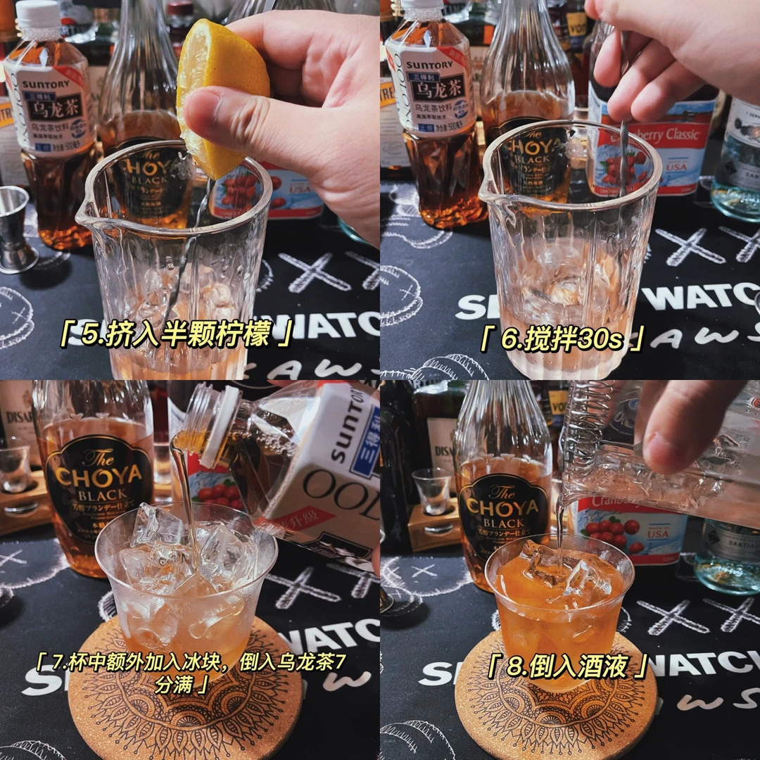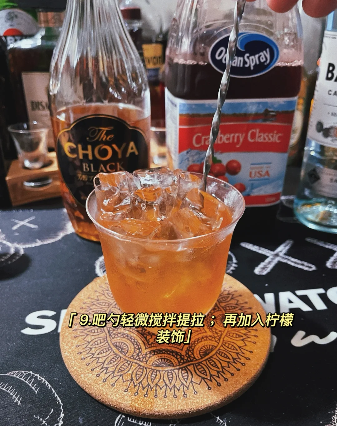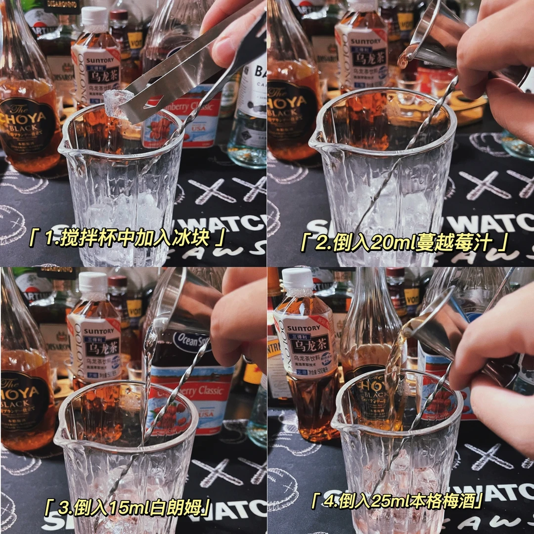CHOYA本格梅酒的酸甜柔醇加以融合蔓越莓汁的酸涩交织,口感更富有层次感,同时加入老冰和白朗姆酒增加风味,最后与乌龙茶的勾兑调和,酒香亦带着茶香,夜晚饮茶微醺,清心醉人。[喝奶茶R][喝奶茶R]