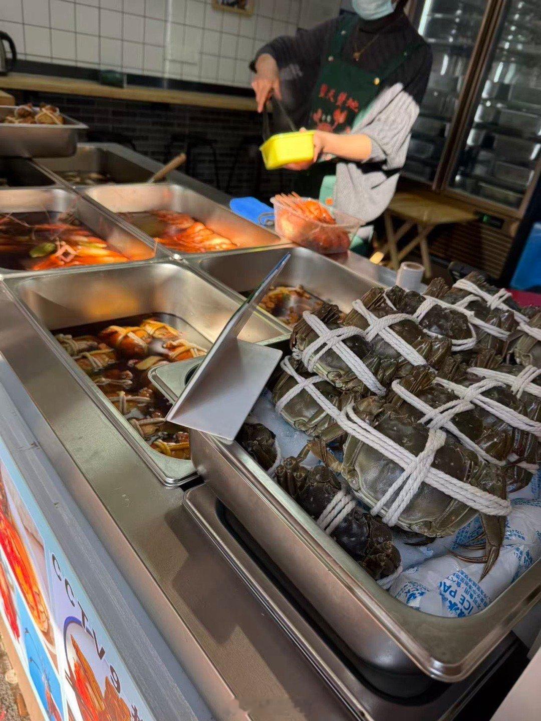 本来盐湖城好友的苏州妹妹计划招待我们一天,晚上去吃苏帮菜的;但本博观光大半天有些劳累就婉拒了。然后乖妈走过“蟹天蟹地”就双脚胶着地面,两眼发光了。于是买了一堆糟虾糟蟹回酒店慢慢享用。