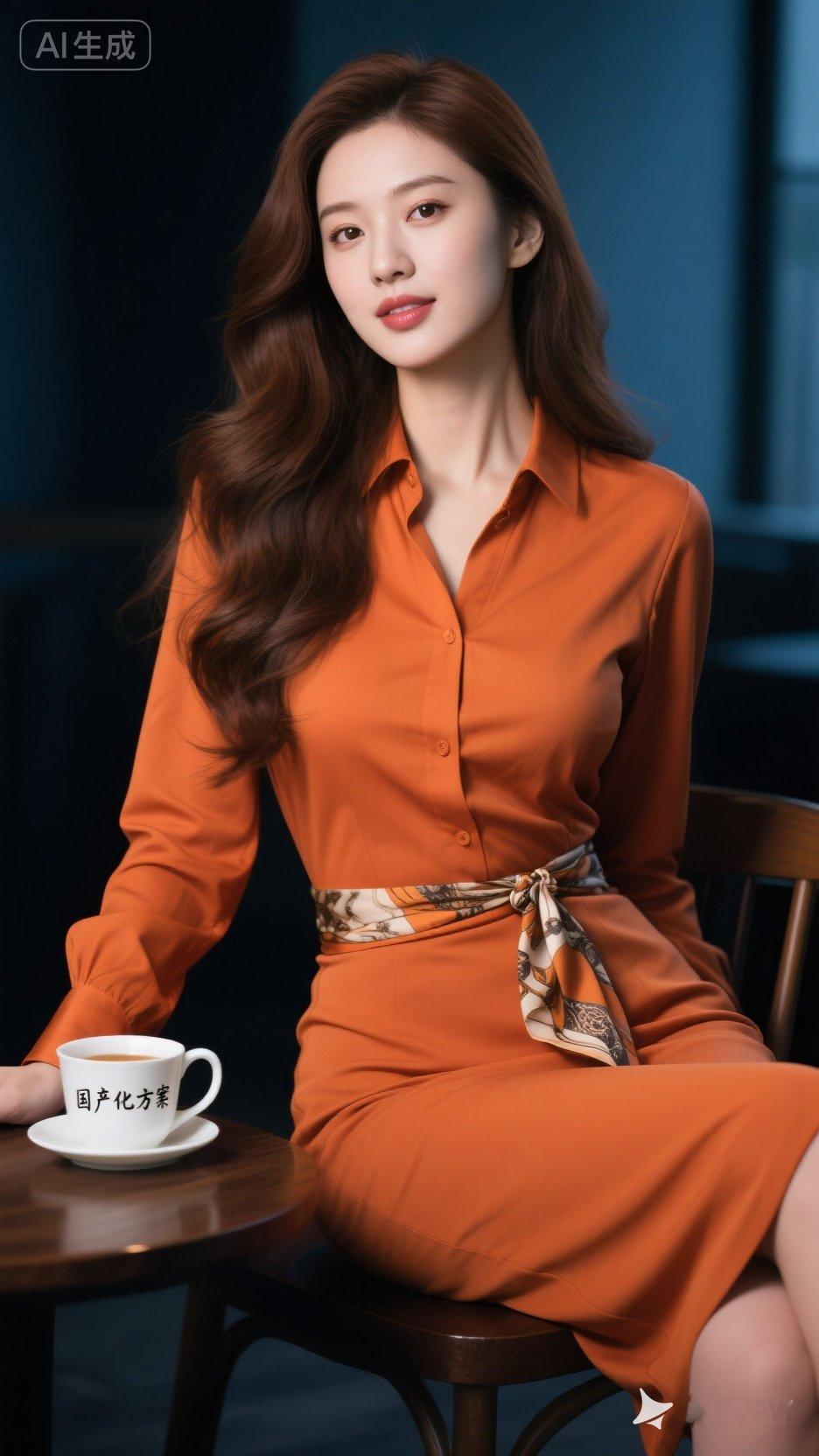 日常上班,选一件橙调的轻薄针织上衣,搭配直筒半裙,简约又优雅。像橘红色针织配藏青色直筒半裙,干净且有温柔气场。若觉得单调,加条精致的项链,瞬间提升精致度。