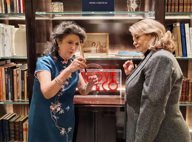 11月26日,在摩纳哥举行的法籍华人画家高醇芳作品展现场,画家高醇芳(左)向摩纳哥驻华大使马思颂展示毛笔用法。新华社记者刘莹摄