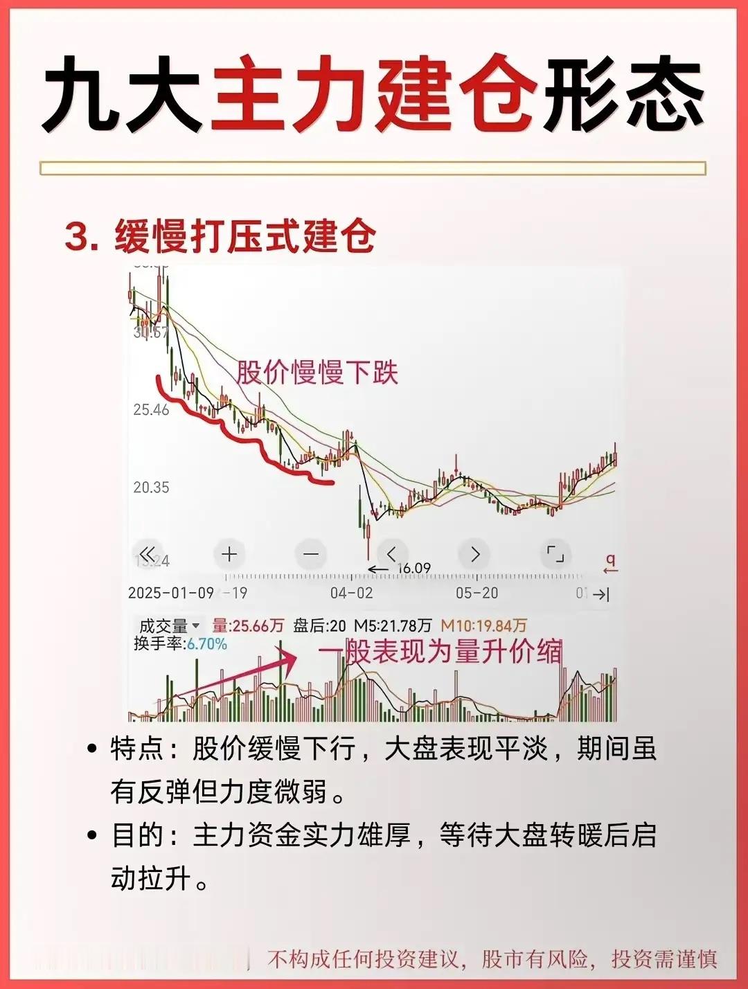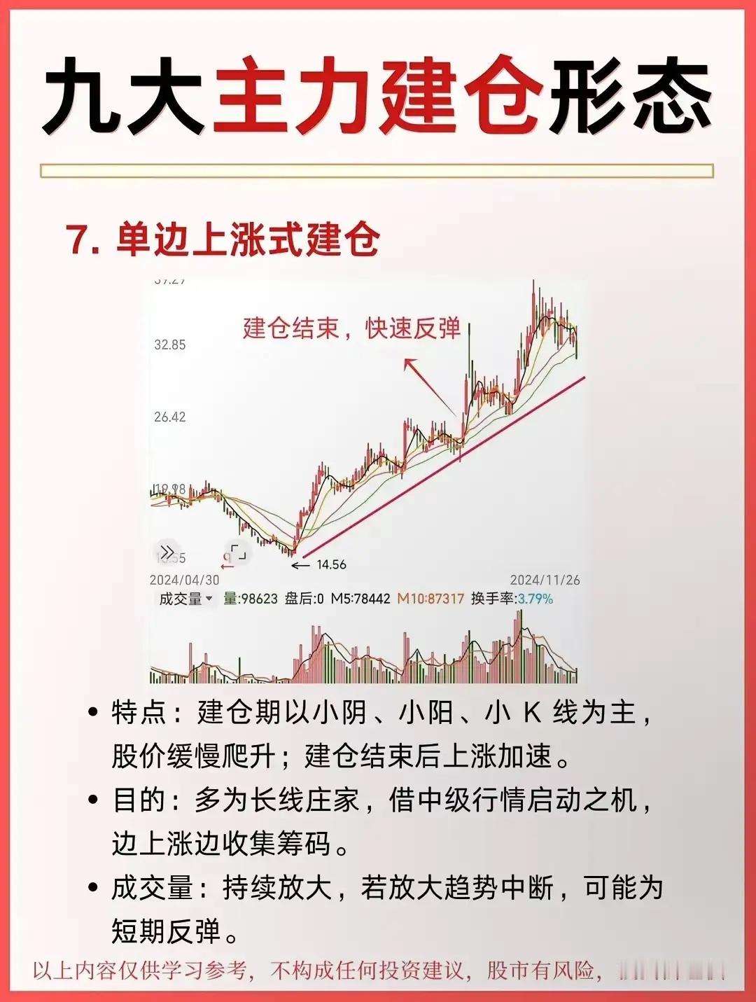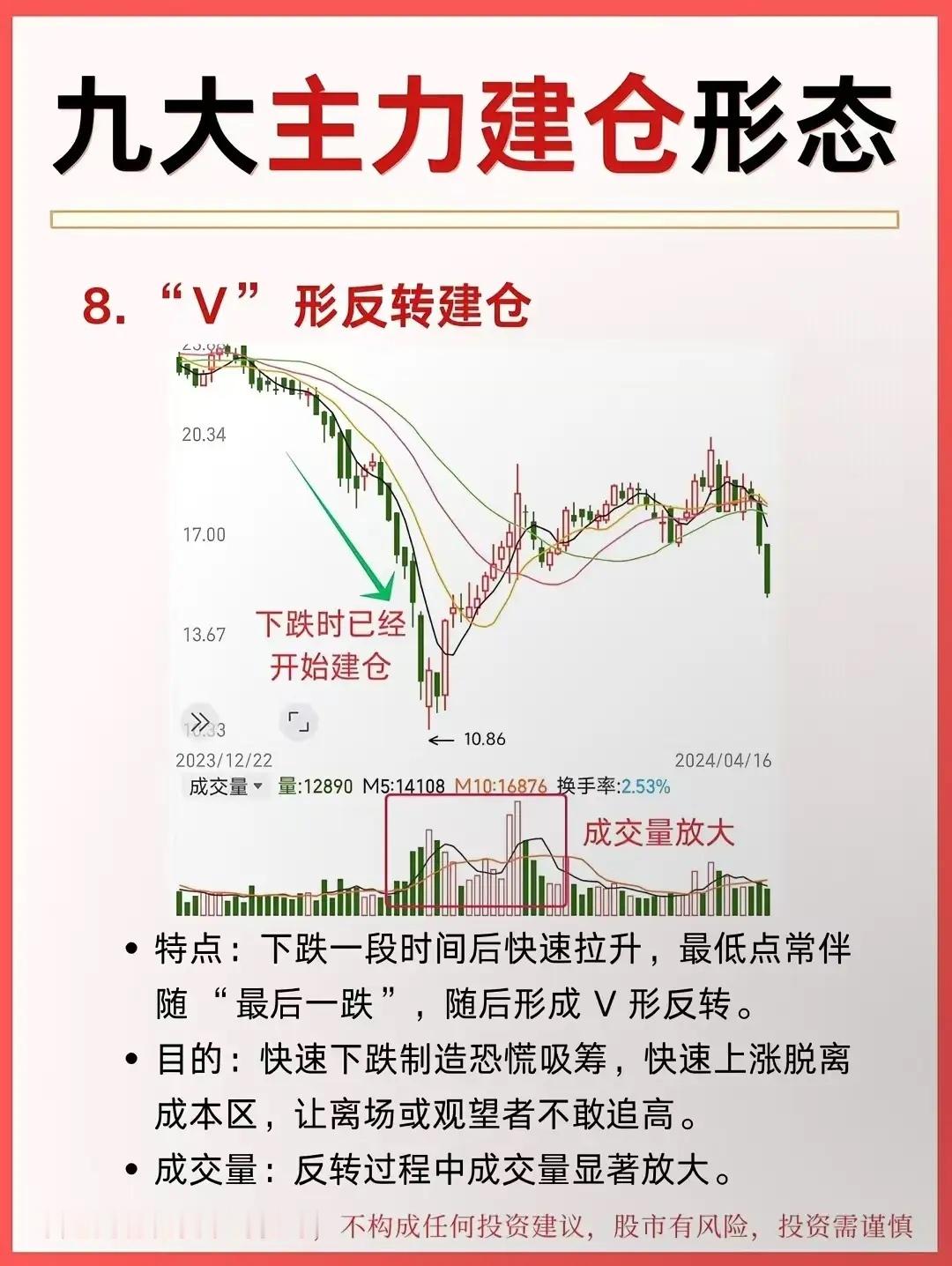 九大主力建仓形态!单边上涨:慢涨温和放量 ;V形反转:急跌急涨放量箱体震荡箱内反复,破上沿启动快速上涨:缓慢打压:缩量阴跌破趋势线拉升快速打压:大阴砸盘,恐慌后启动长期震荡:横盘数月破平台启动。主力建仓的“闪电战”:V形反转建仓!股价先一路下探,在“最后一跌”里,主力已经悄悄开始吸筹;随后直接旱地拔葱式拉升,走出V字曲线。这波操作的核心是“快”——快速下跌砸出恐慌盘,快速上涨脱离成本区,让想抄底的散户根本追不上。