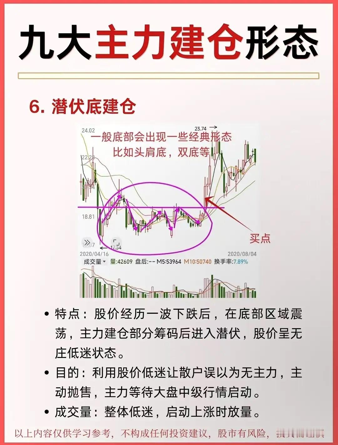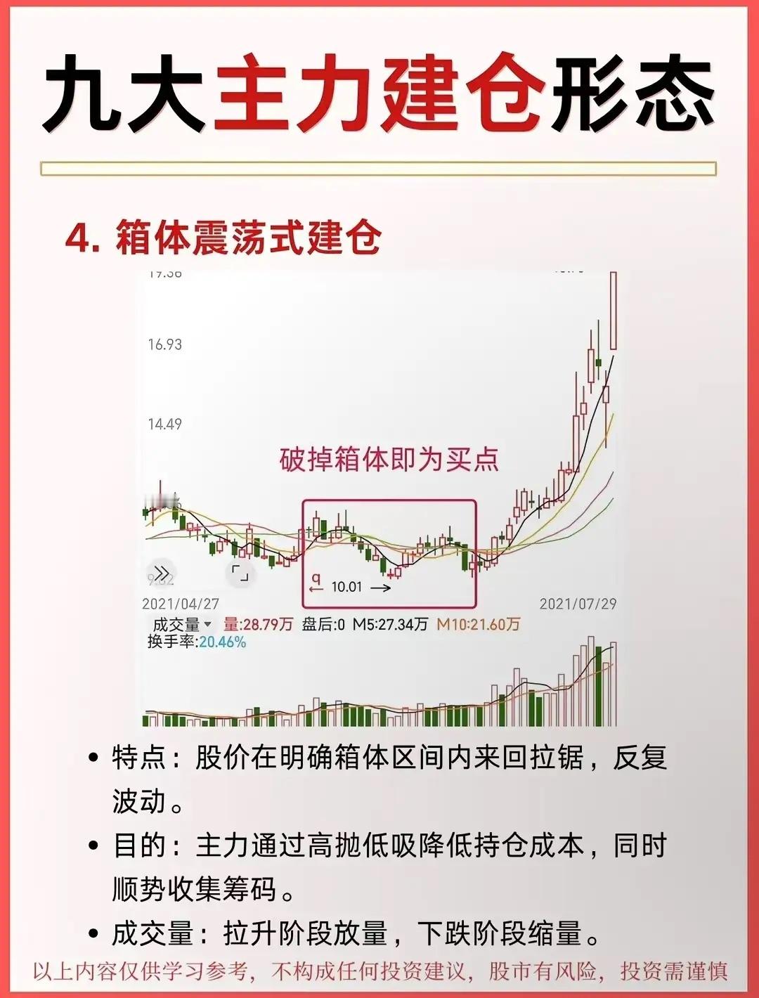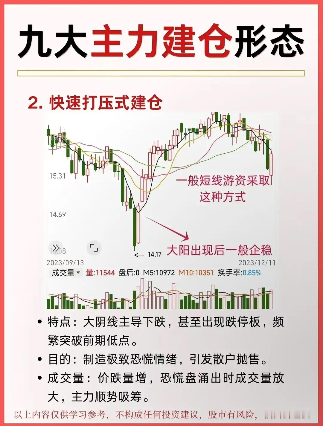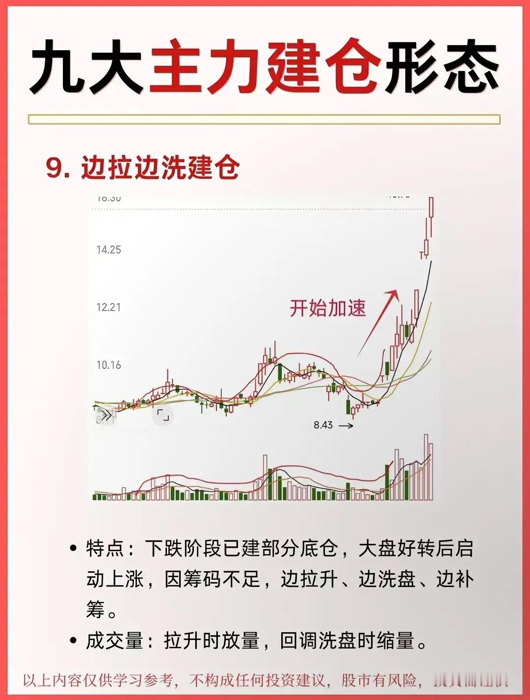 九大主力建仓形态!单边上涨:慢涨温和放量 ;V形反转:急跌急涨放量箱体震荡箱内反复,破上沿启动快速上涨:缓慢打压:缩量阴跌破趋势线拉升快速打压:大阴砸盘,恐慌后启动长期震荡:横盘数月破平台启动。主力建仓的“闪电战”:V形反转建仓!股价先一路下探,在“最后一跌”里,主力已经悄悄开始吸筹;随后直接旱地拔葱式拉升,走出V字曲线。这波操作的核心是“快”——快速下跌砸出恐慌盘,快速上涨脱离成本区,让想抄底的散户根本追不上。