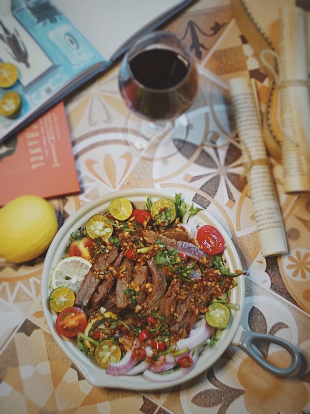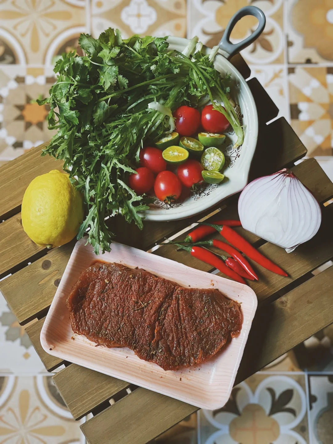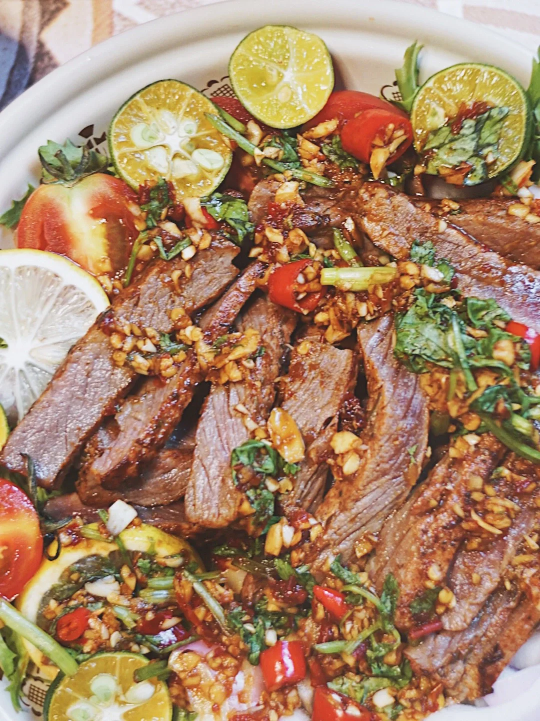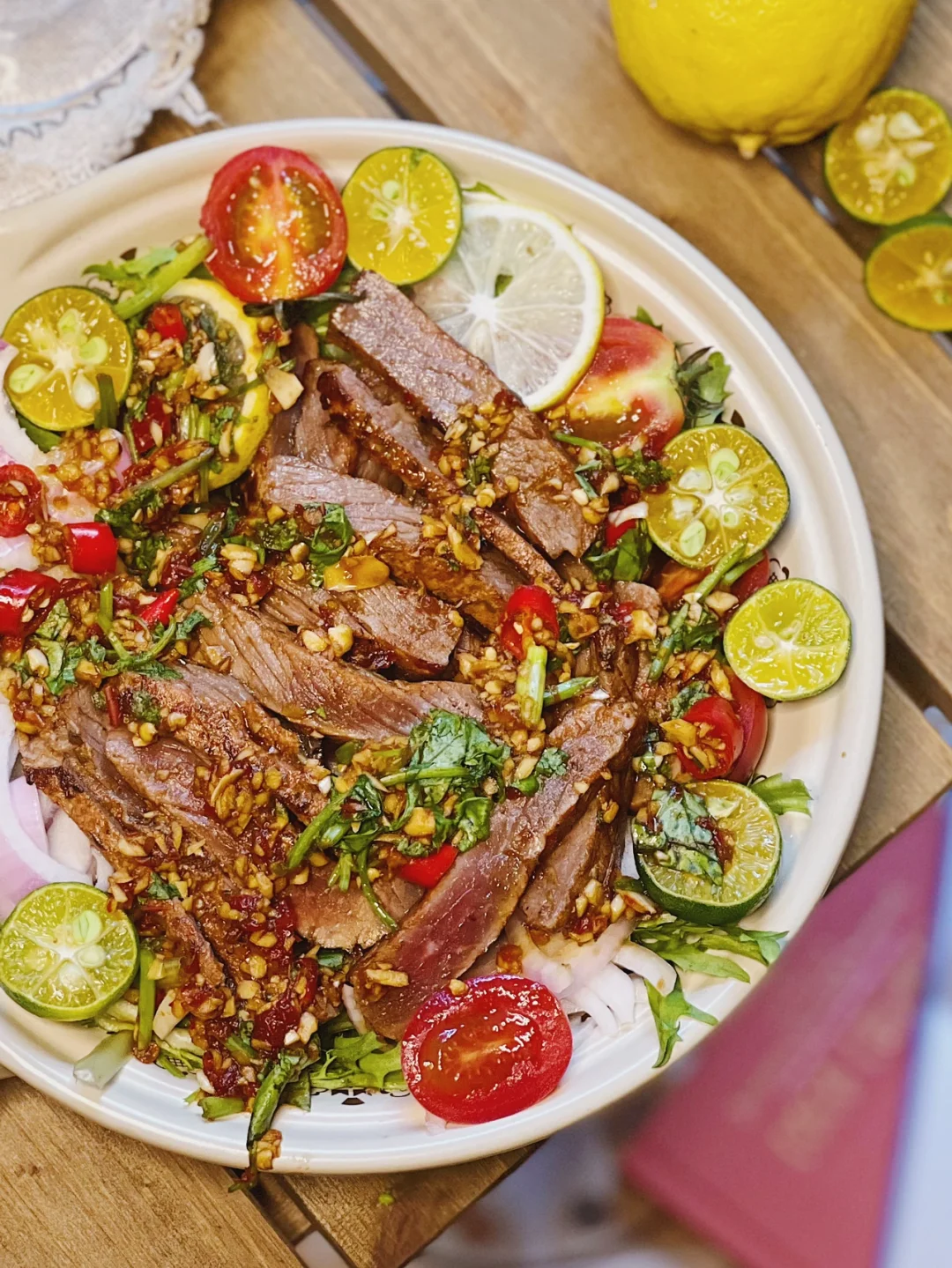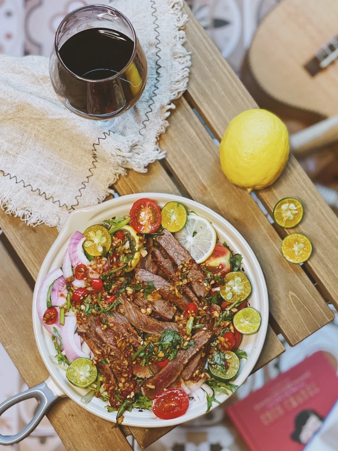 肉感饱满的牛排🥩佐以酸甜的柠檬和甜椒酱🍋