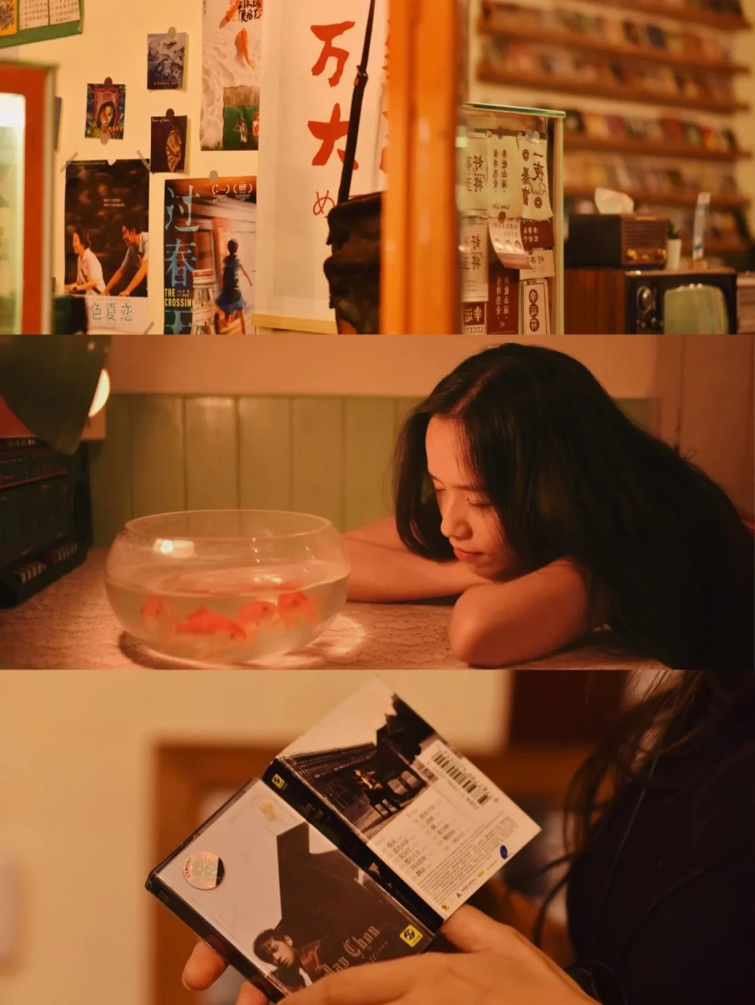 一家像摄影棚的甜品店,复古又港风,有整整一面墙的周杰伦专辑,还有重庆森林海报