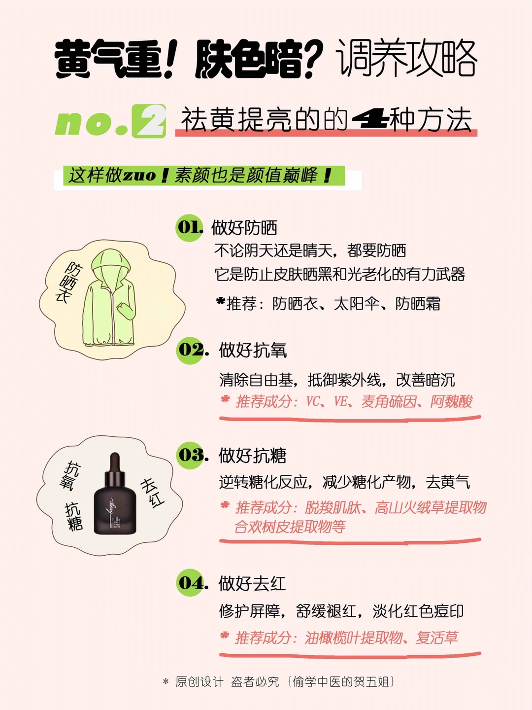 2⃣️👉做好抗氧:清除自由基,改善暗沉——推荐成分:VC、VE、麦角硫因、阿魏酸