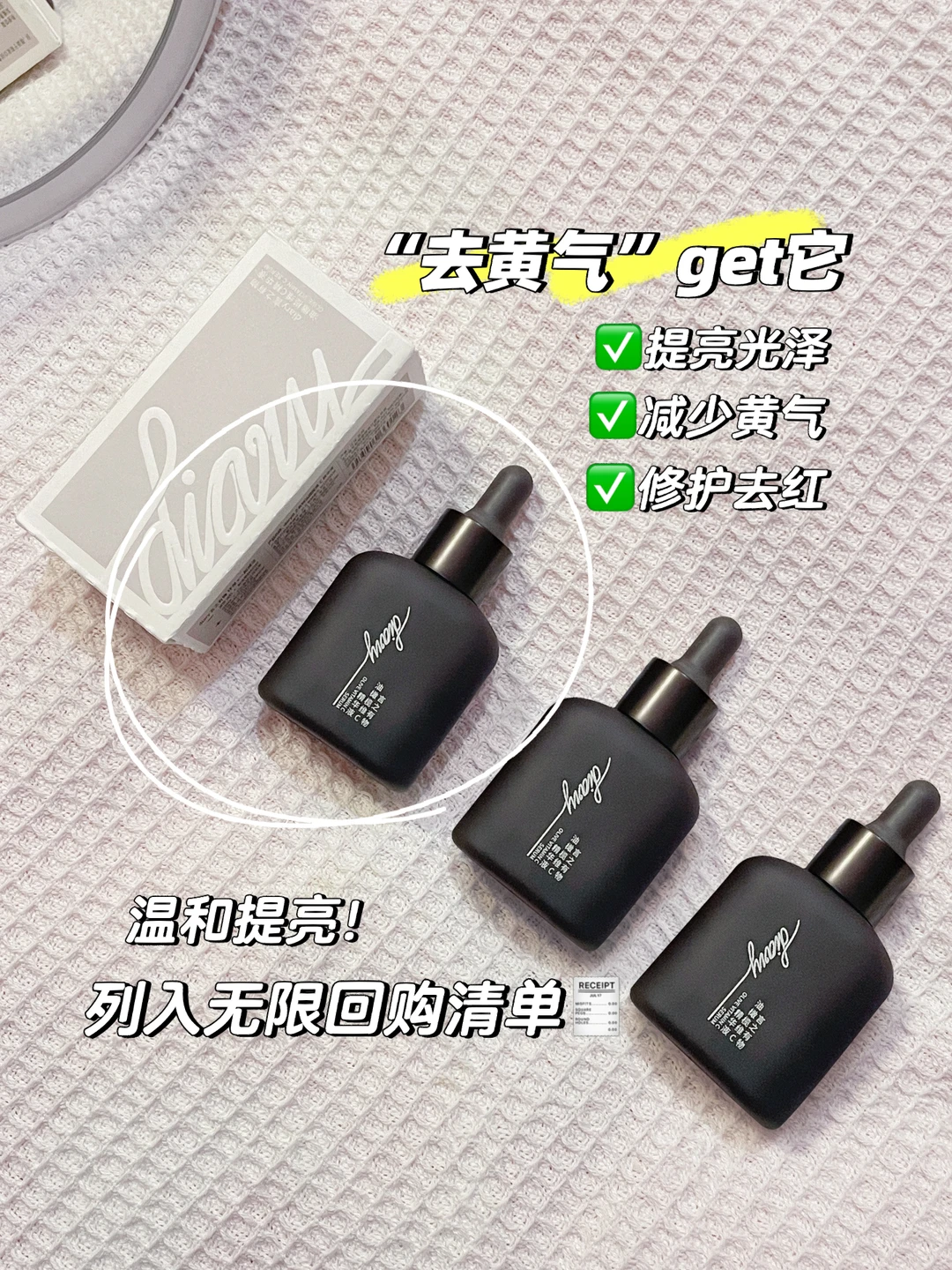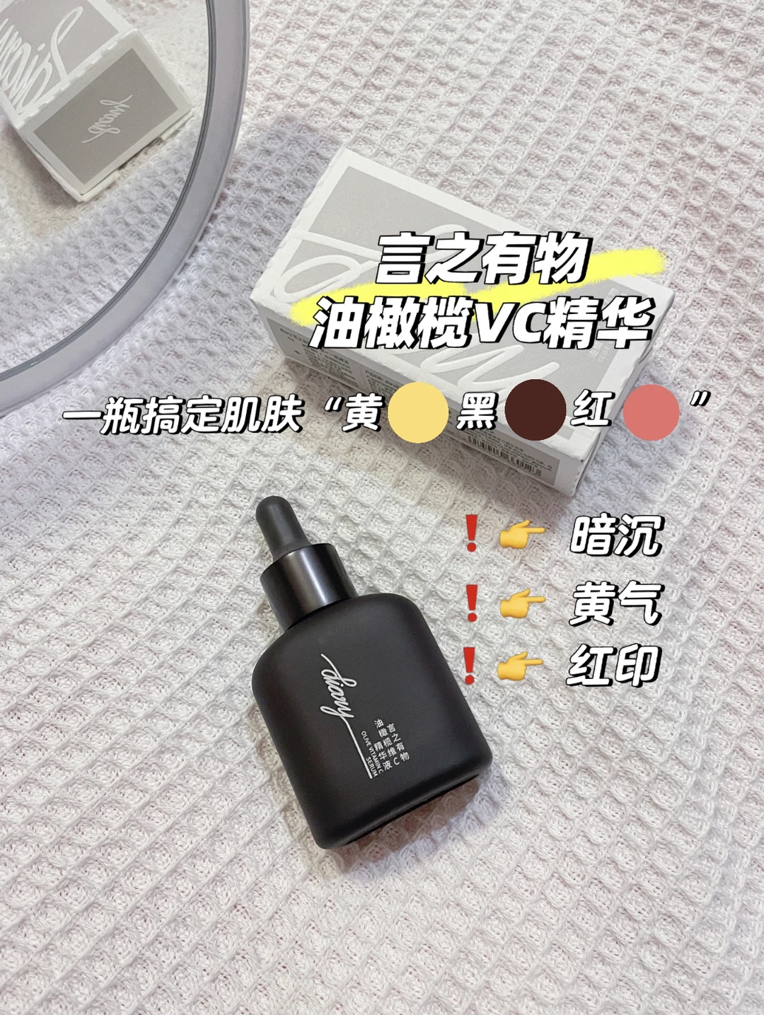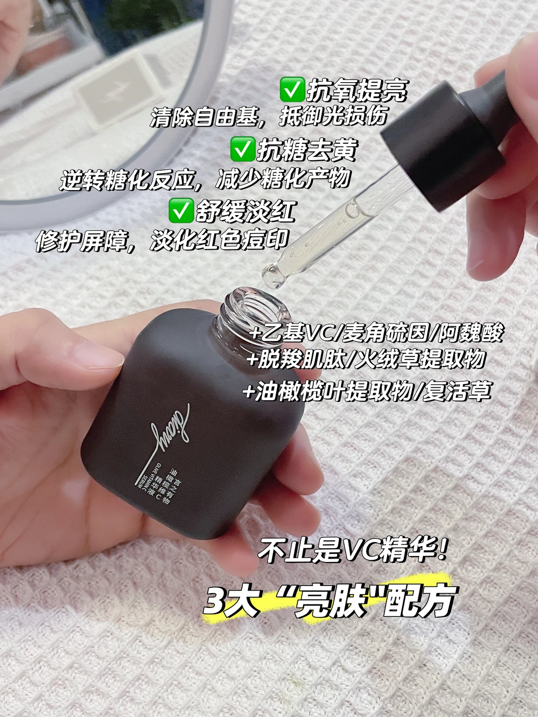 [扯脸H]安利一款言之有物VC精华,它是一款提亮、减黄修红的精华,添加了乙基VC、麦角硫因、脱羧肌肽、油橄榄叶提取物等去黄褪红成分[色色R][色色R]抗氧+抗糖+去红