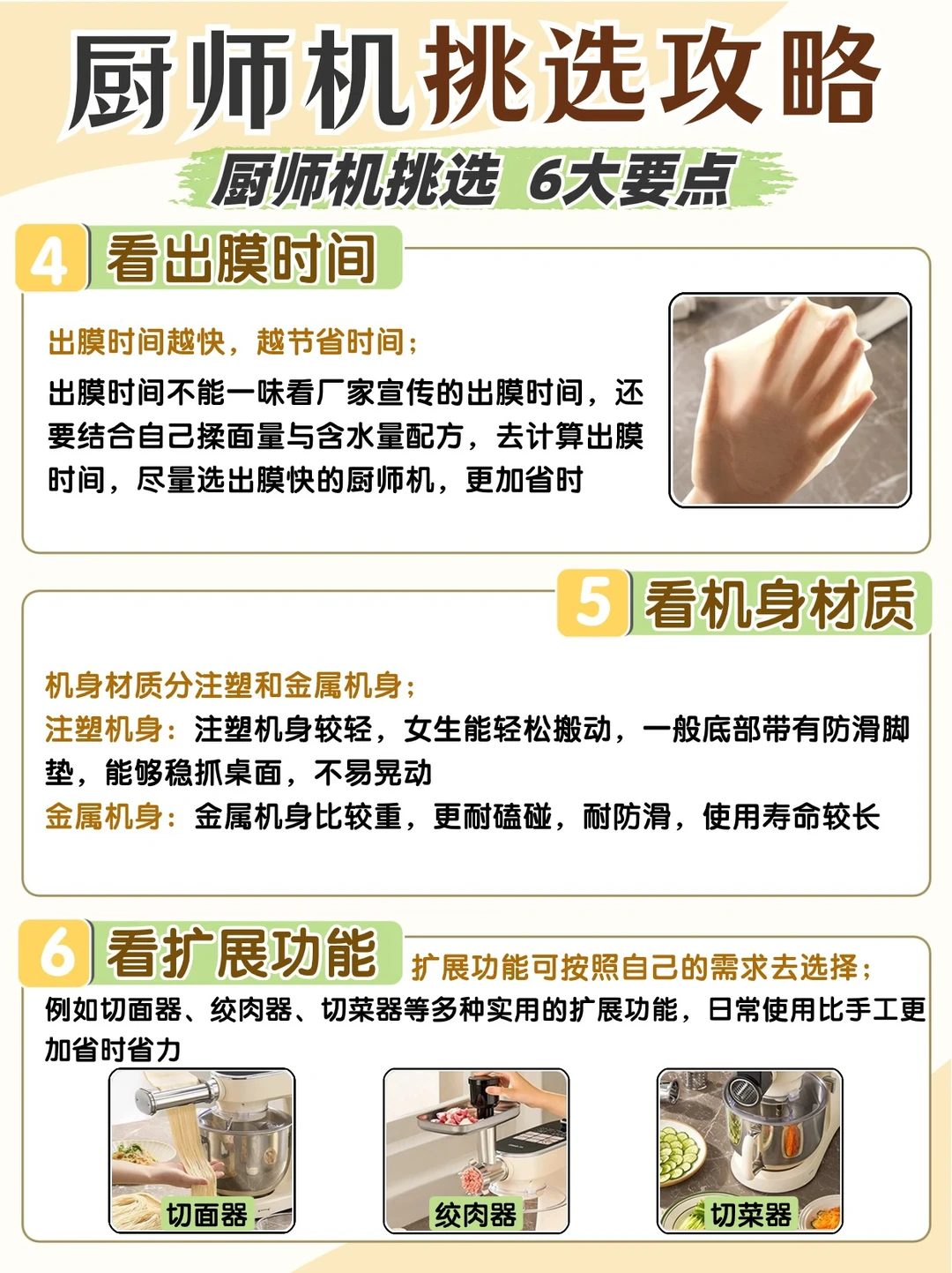 扩展功能可按照自己的需求去选择;例如切面器、绞肉器、切菜器等多种实用的扩展功能,日常使用比手工更加省时省力