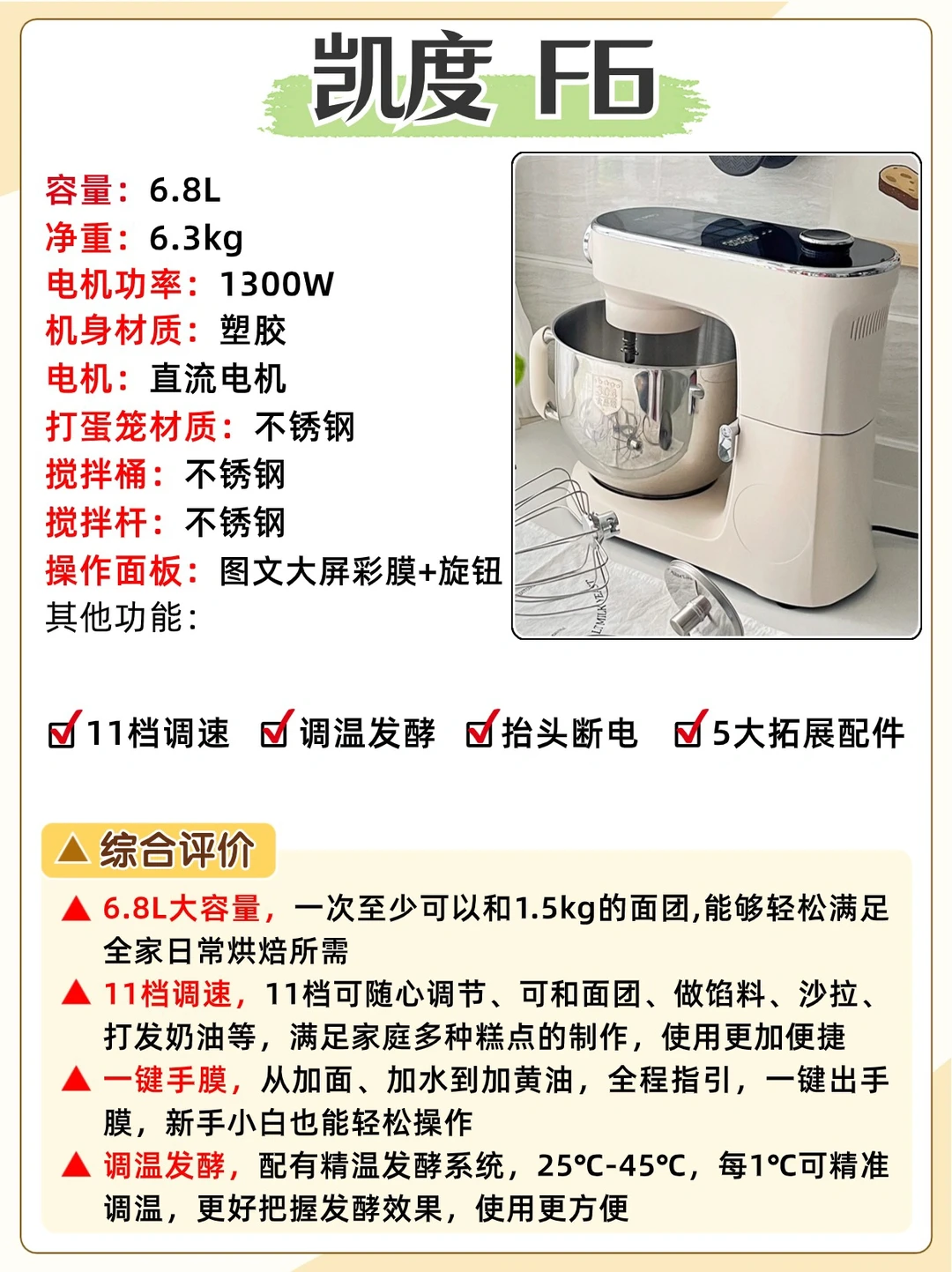 结合以上千元机中综合来看凯度F6整体性价比不错,少有的大彩屏操作,还能1℃精准控温发酵,还有拓展功能,新手宝宝可以闭眼冲~