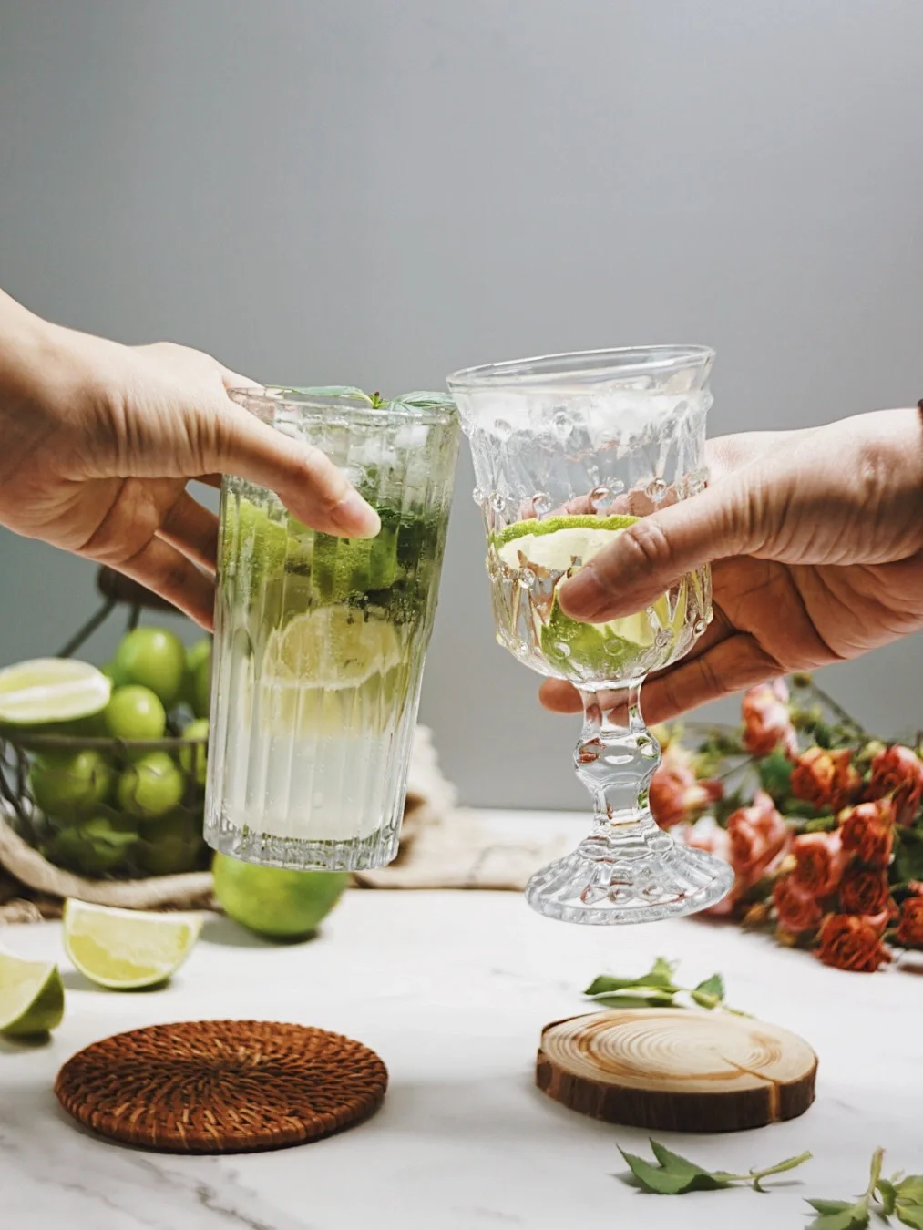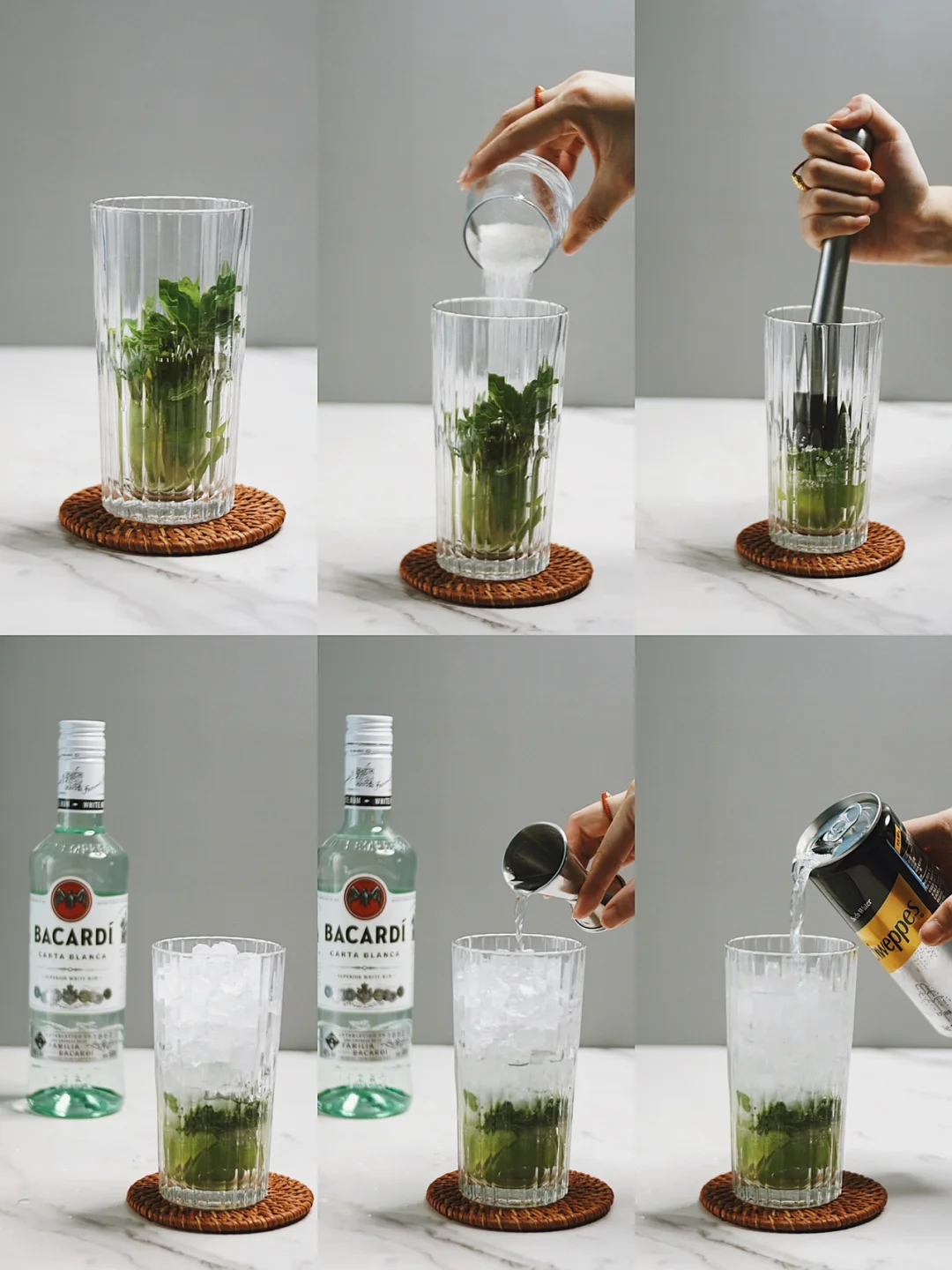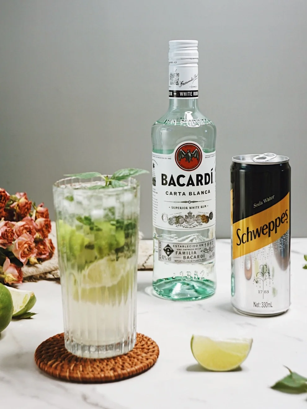 ▪️调饮步骤:杯中放入4个青柠角、6片薄荷叶、2勺白砂糖,用捣汁棒按压出汁;先加入几片拍醒的薄荷叶和两三个青柠角压一压,倒入碎冰、50ml百加得白朗姆酒、25ml青柠汁、25ml怡泉苏打水,再用薄荷叶🍃装饰一下
