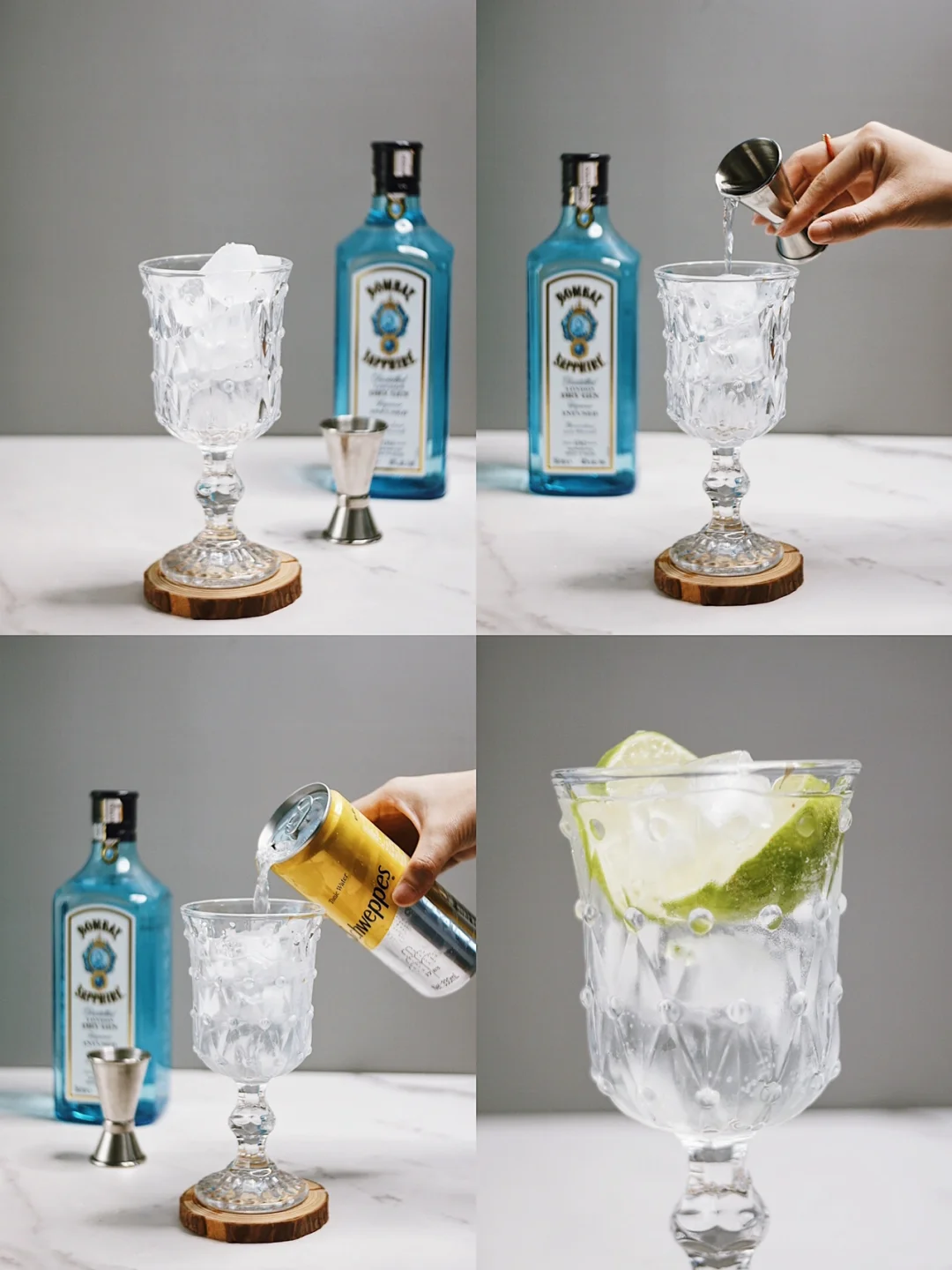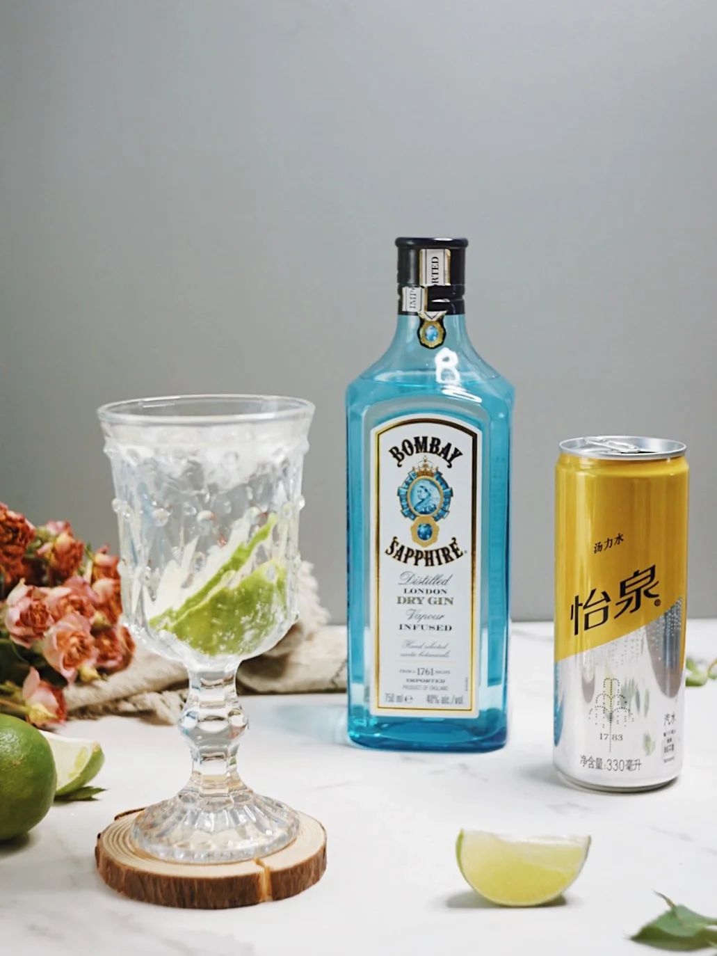 ▪️调饮步骤:杯中加满冰块,依次倒入40ml孟买蓝宝石金酒、120ml怡泉汤力水、放入一个青柠角,用吧勺轻轻搅拌即可
