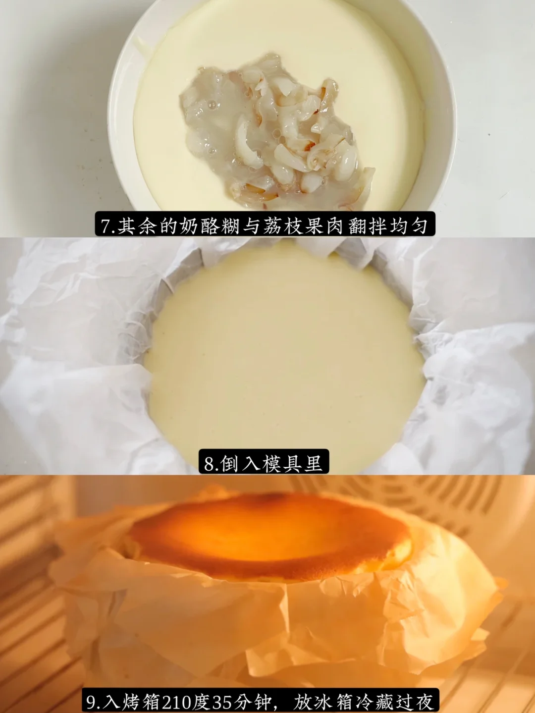 4️⃣荔枝去皮去核,切成小块与其余奶酪糊翻拌均匀,倒入模具里,震出气泡,放入烤箱210度35分钟