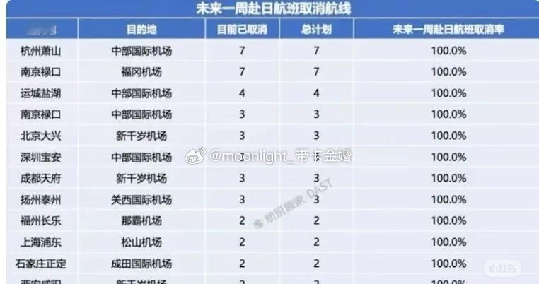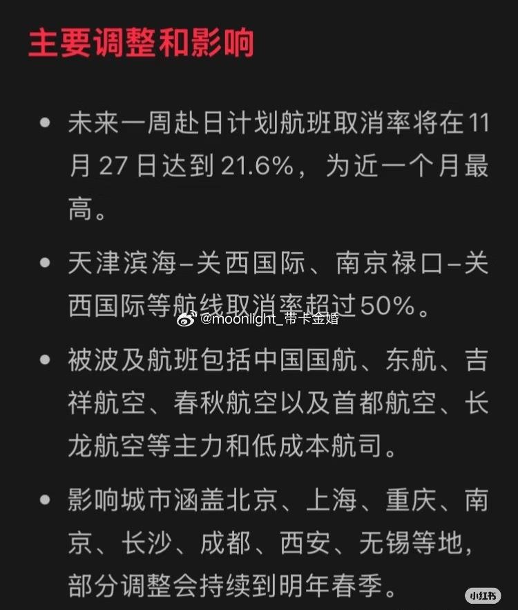 中方下月要取消超900架次赴日航班日本首相高市早苗仍在嘴硬,拒不撤回“台湾有事”言论,而日本多行业已在哀号。多家中国航司在2025年12月削减赴日运力,已确认取消904架次,约占当月原计划5548架次的16%,涉及72条航线、约15.6万个座位;较11月25日的268架次显著上升。此次调整覆盖13个日本机场,其中关西国际机场取消最多(626班),成田与名古屋中部各68班,新千岁为61班,那霸为26班;羽田受影响最小,仅7班取消。按航司看:春秋航空取消182班、吉祥航空取消166班、南方航空取消118班、东方航空取消109班。