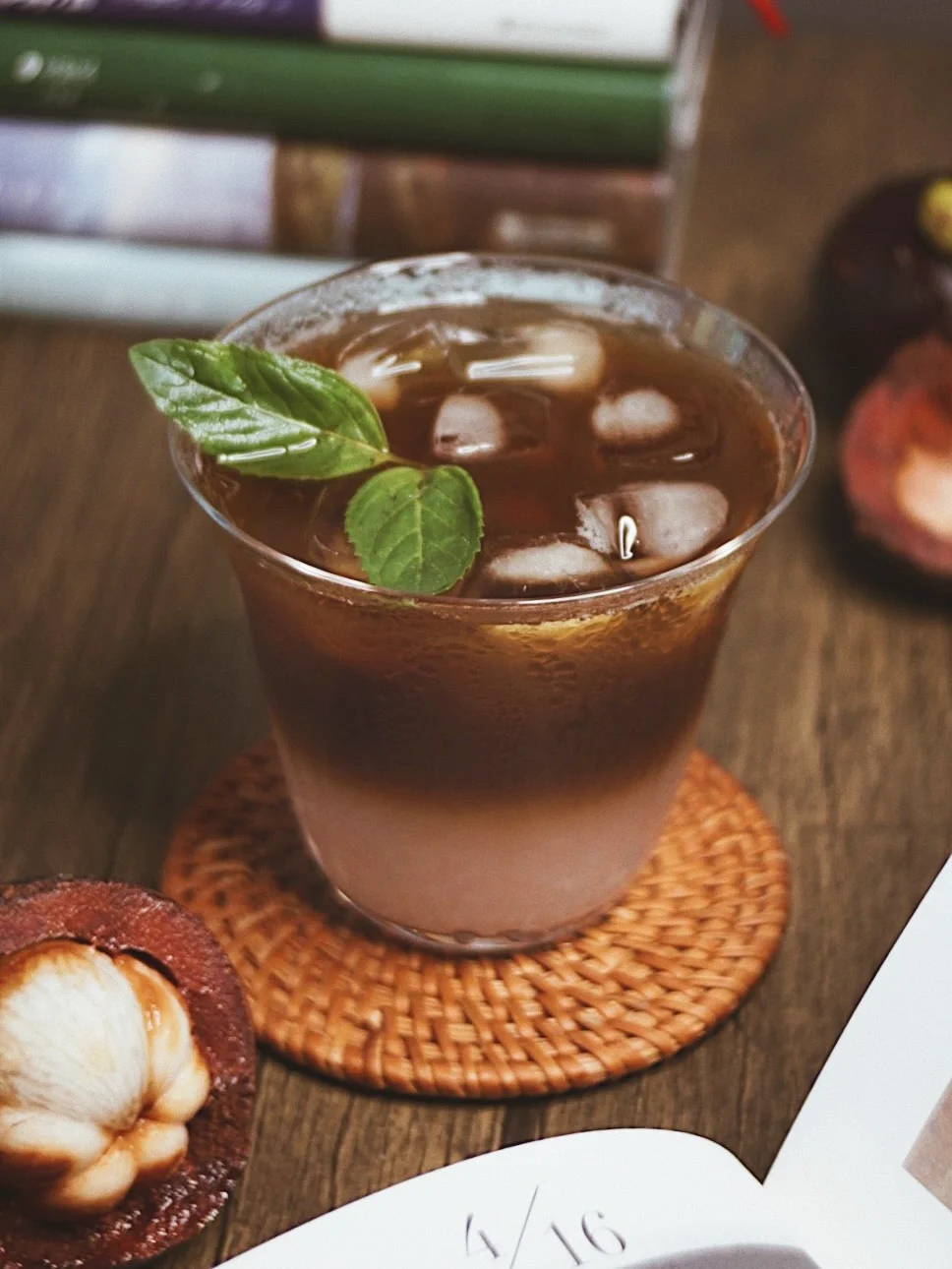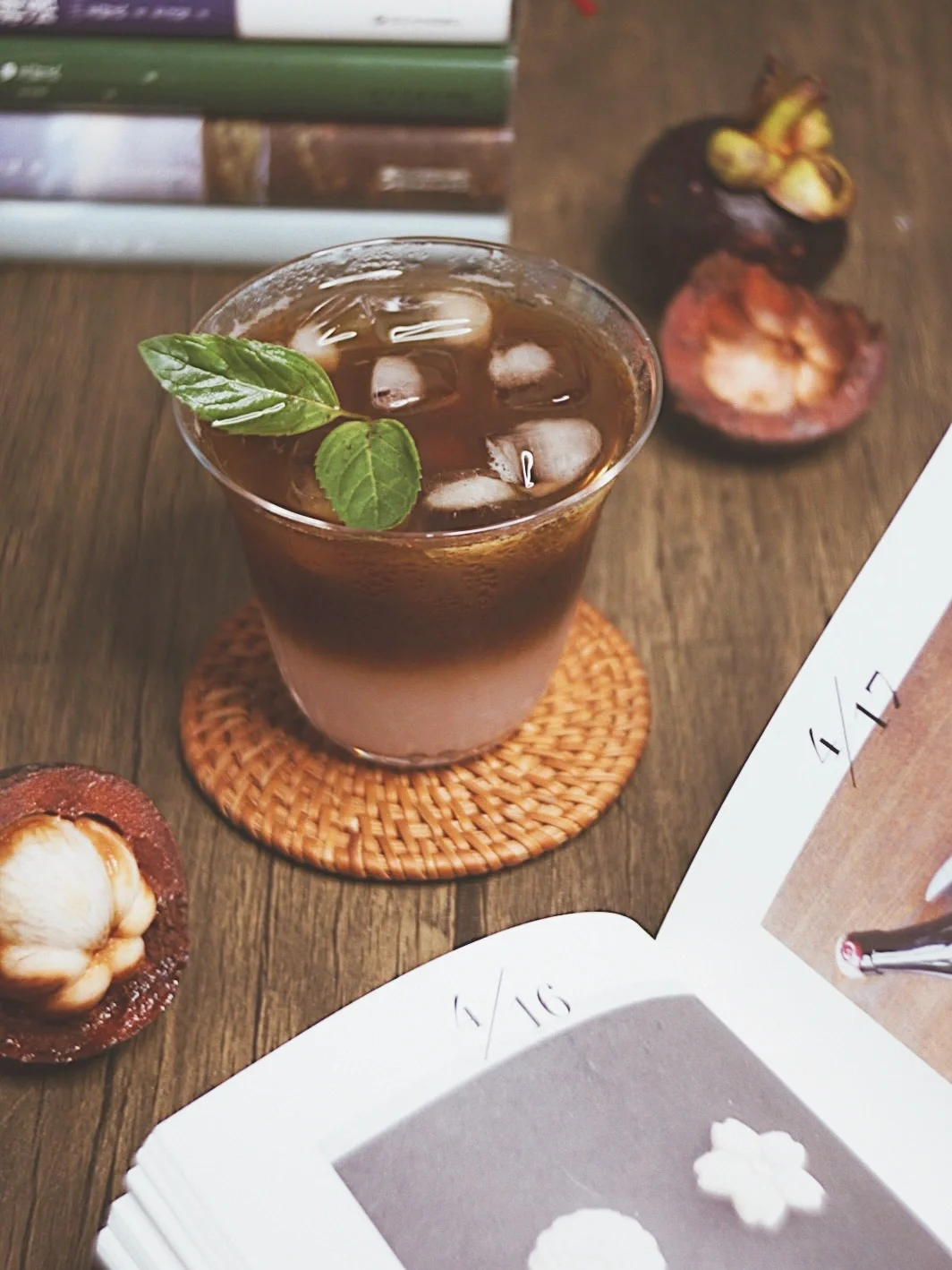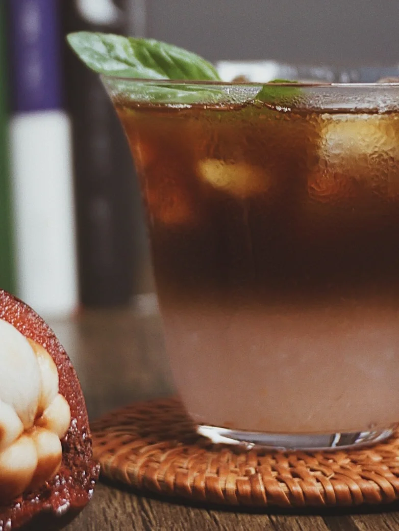 ©️杯中加满冰块,依次倒入煮好的山竹汁和咖啡液
