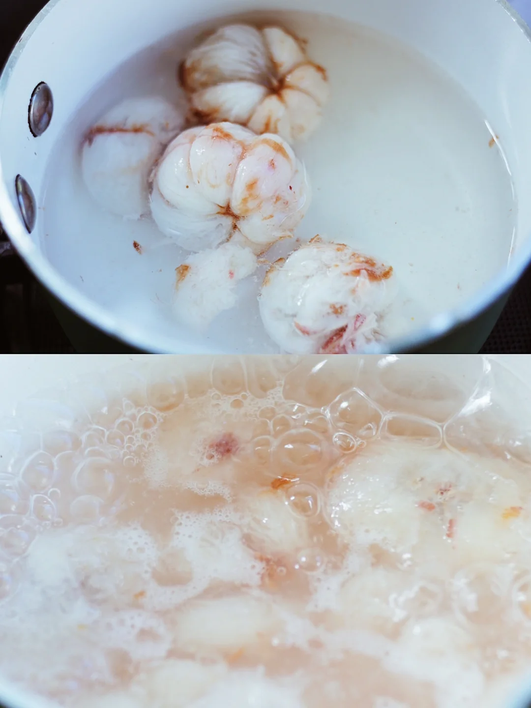 ©️奶锅里依次放入山竹果肉、冰糖和清水,中火一边熬煮一边搅拌,煮出淡粉色,倒入柠檬汁,放凉