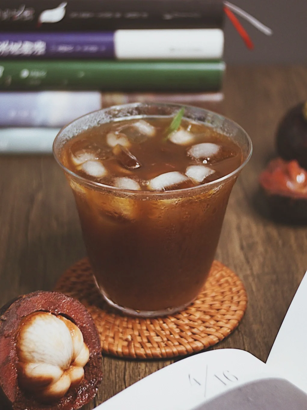 手边放着一杯加满冰块,汁水香甜的特调咖啡