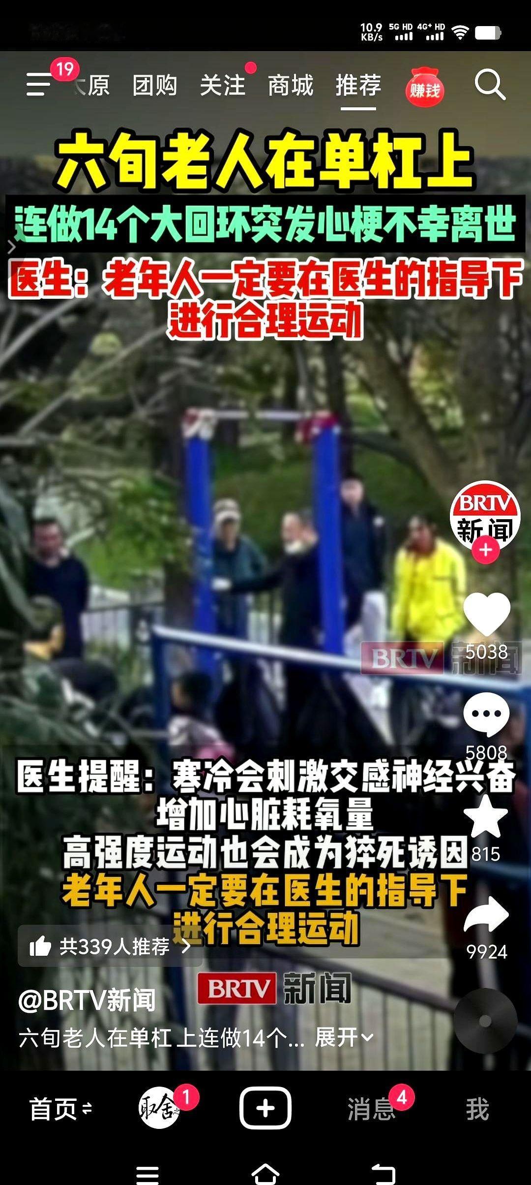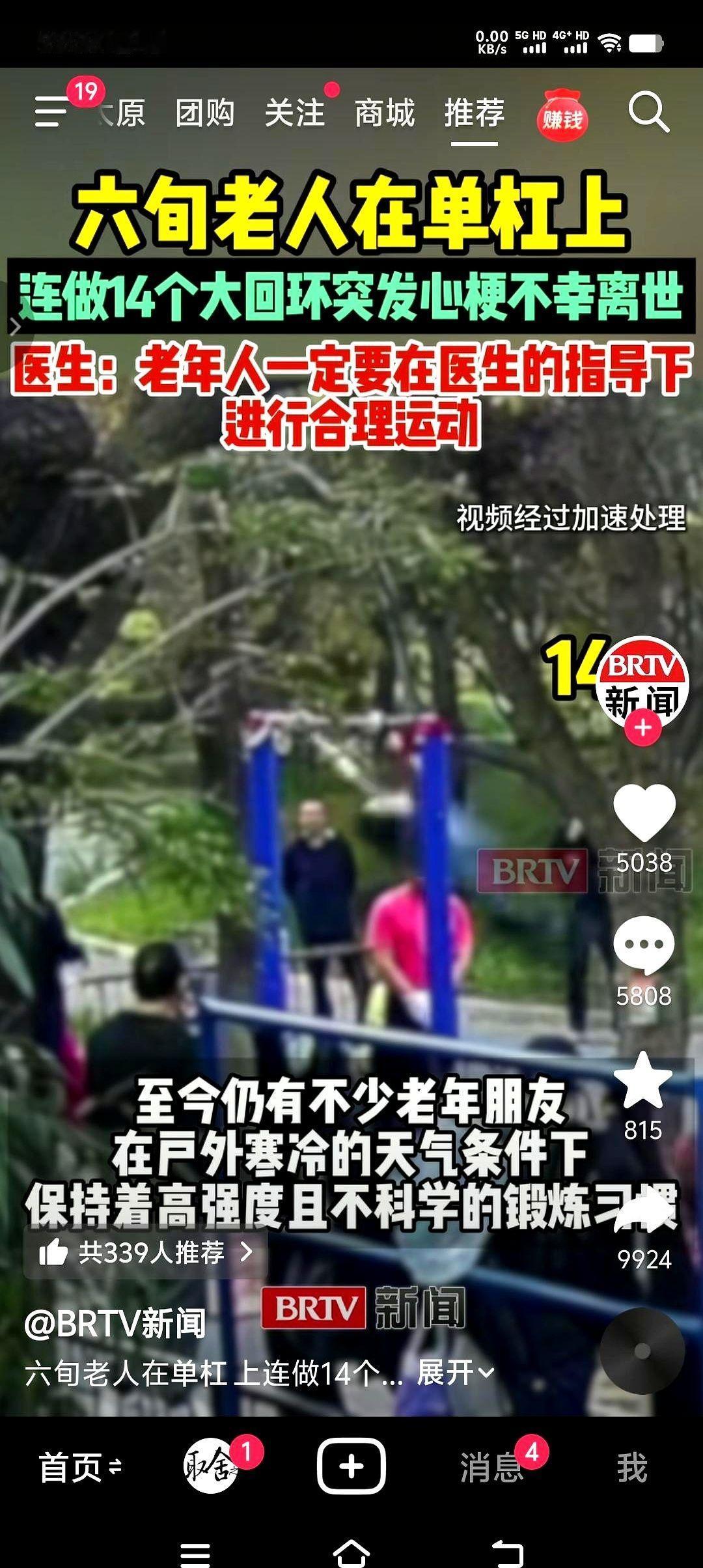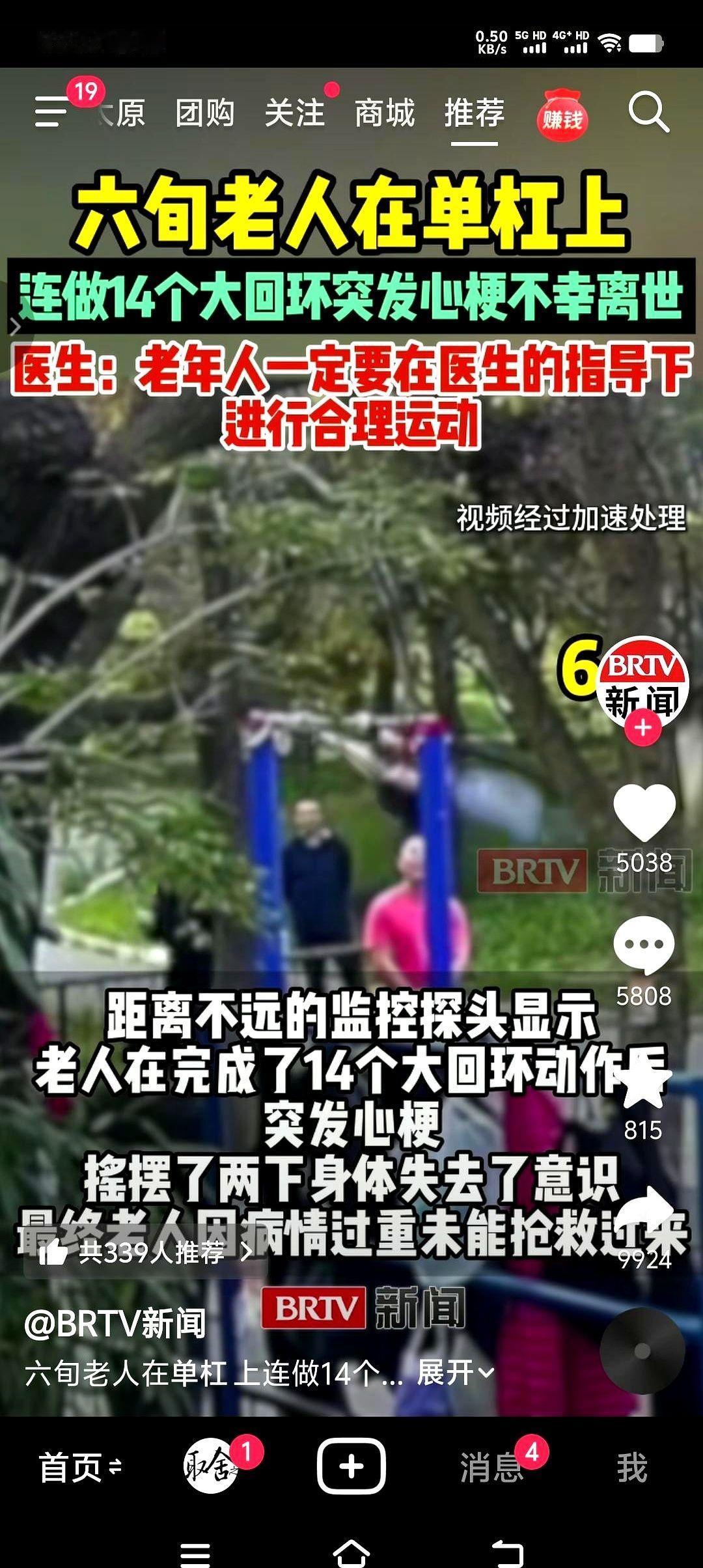 用绳子把自己绑在单杠上,连甩14个大回环。 然后,人没了。 心梗。一个60多岁的大爷,就这么走了。 刷到这个视频的时候,我半天没缓过神。别说14个,我一个都费劲,那可是拿命在甩啊。 图啥呢? 说白了,他不是在锻炼,他是在“证明”。 证明给谁看?证明给儿女,证明给路人,还是证明给自己那个不服老的心?我猜是最后一个。 人到了一个岁数,最怕听到的就是一句“你不行了”。这三个字,比什么都伤人。所以他要用这种近乎悲壮的方式,跟时间掰手腕,告诉所有人,也告诉自己:我还没老,我还能打。 那根绳子,看着是保护,其实是断了所有后路。它捆住的不是身体,是尊严,是不甘心。 他赢了吗?在倒下的前一秒,他或许觉得自己赢了。他感受到的不是身体的极限,而是意志的胜利。 可代价太大了。 其实人老了,最该学会的不是更高更快更强,而是跟自己和解。跟那个皱纹、白发、体力下降的自己,握手言和。 身体这东西,你敬它一尺,它才能还你一丈。你跟它玩命,它就真的会要你的命。
