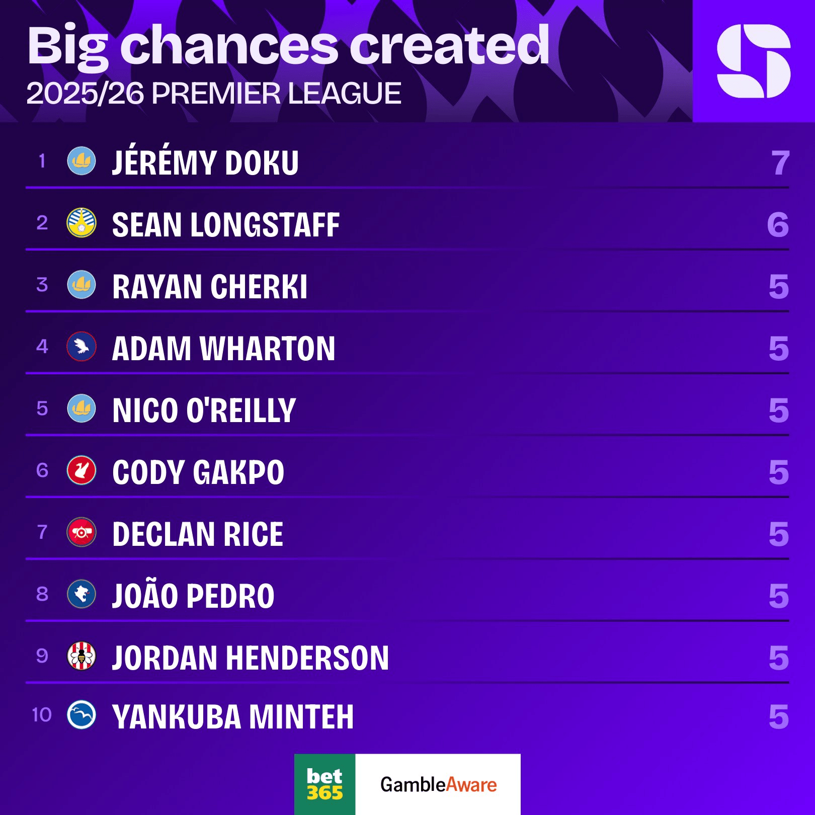 3.谢尔基、亚当-沃顿、尼科-奥赖利、加克波、赖斯、若昂-佩德罗、亨德森、明特5次