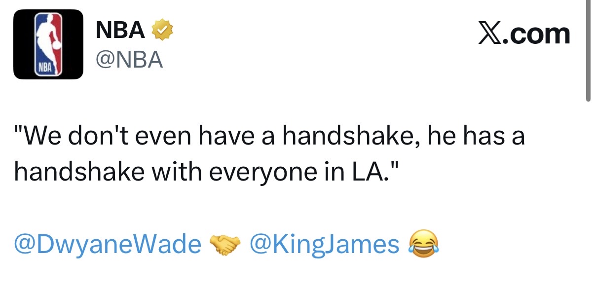 在看到勒布朗-詹姆斯和他的队友用不同的握手礼致意时,韦德调侃道: