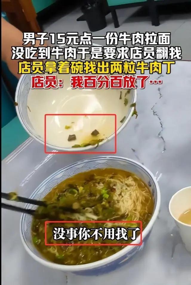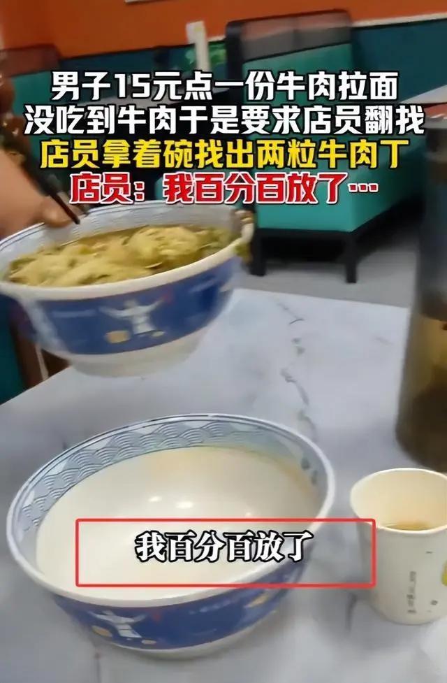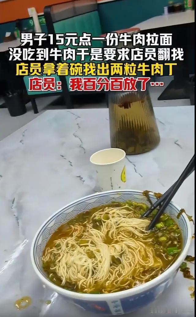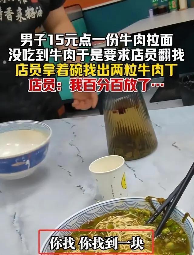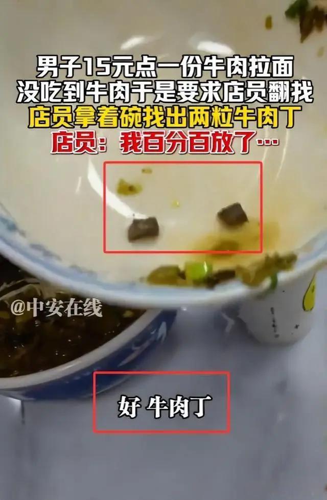 15元牛肉面里找牛肉,像在玩“大家来找茬”!新疆大哥点碗酸菜牛肉拉面,筷子搅到胳膊酸都没见肉影。厨师信誓旦旦说“百分百放了”,结果当场翻箱倒柜——好家伙,在碗底扒拉出两粒牛肉丁,还没芝麻大! 这哪是牛肉面,分明是“牛肉概念面”!评论区炸锅:明码标价写着牛肉面,给两粒肉丁糊弄谁?现在较真的人多了,录视频、找证据、12315投诉,专治各种耍心眼。要我说,下次点单先问老板:“您这牛肉是按粒算还是按克称?” 社会百态 消费权益 牛肉面刺客 (图源网络,侵删)
