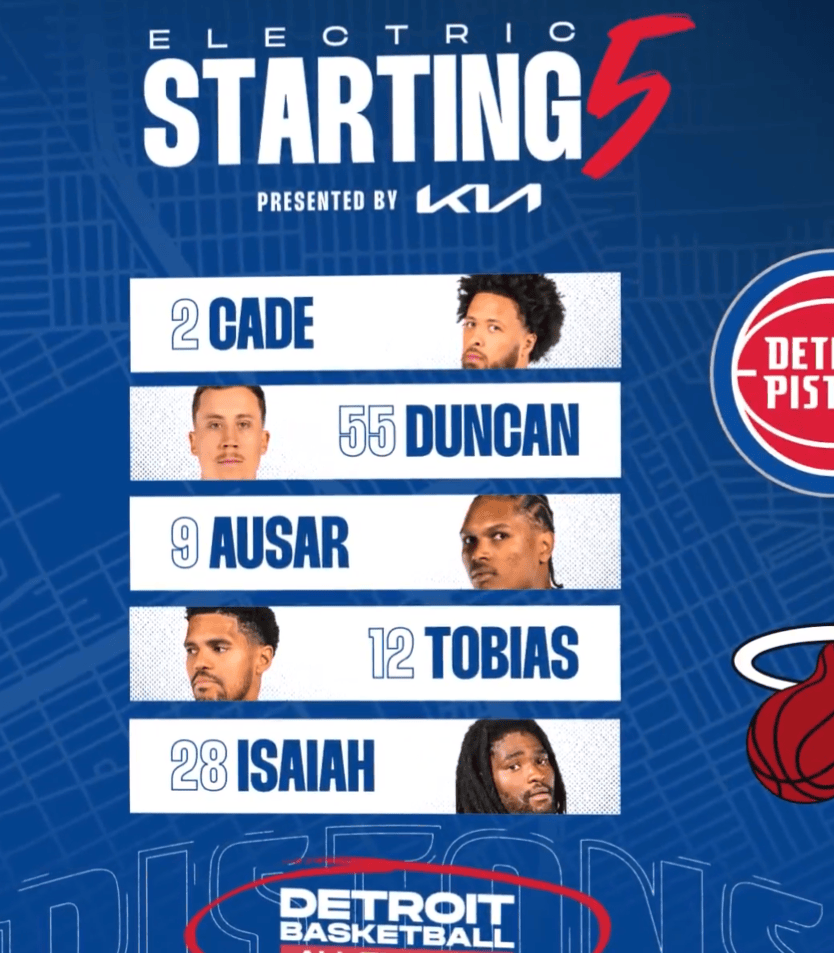 赛前,活塞社媒发布本场比赛的首发球员:凯德-坎宁安、邓肯-罗宾逊、奥萨尔-汤普森、托拜厄斯-哈里斯、以赛亚-斯图尔特。
