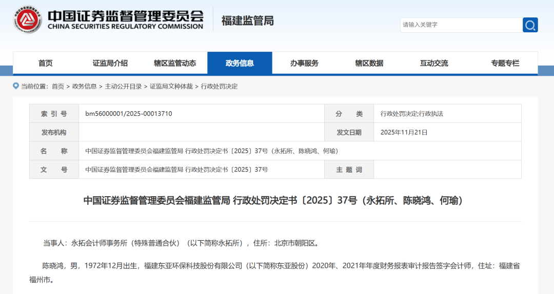 中国证券监督管理委员会福建监管局行政处罚决定书〔2025〕37号(永拓所、陈晓鸿、何瑜)
