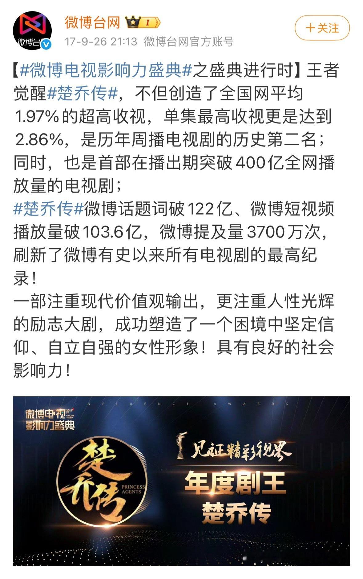 网上做假表格的太多了,不得不亲自找资料验证下,2017年年度剧王是赵丽颖的《楚乔