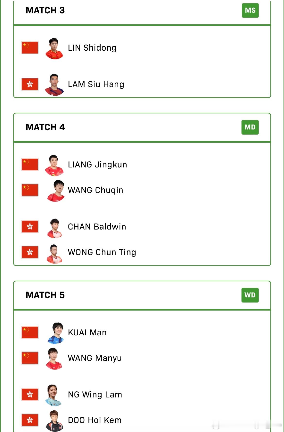2025成都混合团体世界杯 Group 1🇨🇳中国🆚中国香港🇭🇰混双:王楚钦/孙颖莎🆚黄镇廷/杜凯琹女单:蒯曼🆚朱成竹男单:林诗栋🆚林兆恒男双:梁靖崑/王楚钦🆚黄镇廷/陈颢桦女双:王曼昱/蒯曼🆚杜凯琹/吴咏琳