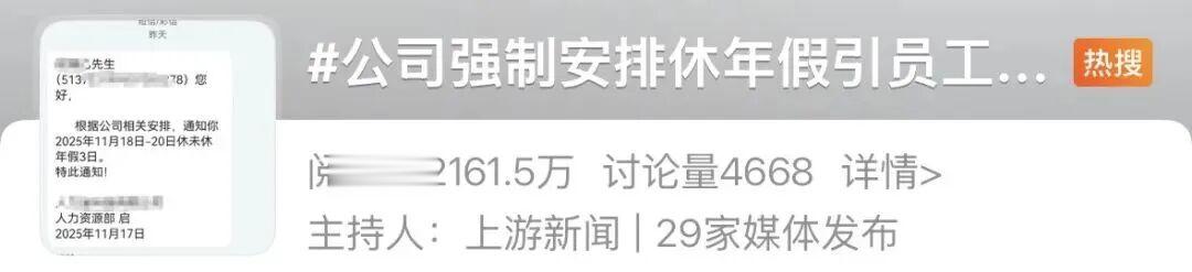 近日,北京王先生收到公司人力资源部短信,“根据公司相关安排,通知你2025年11月18日-20日休未休年假3日,特此通知!”
