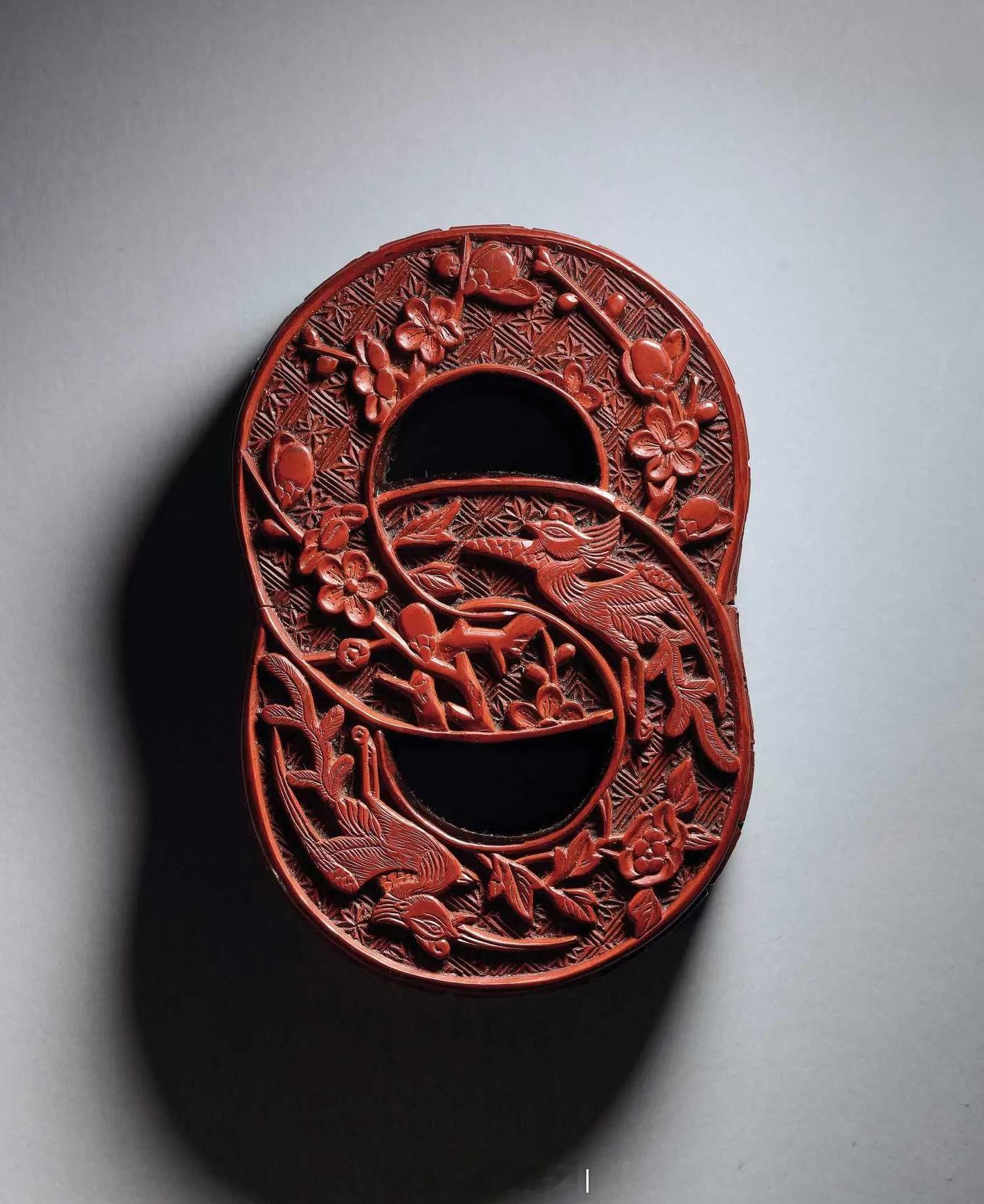 髹饰录 | 明晚期 剔红凤穿花纹双环式盒此盒设计巧妙,为双环式,甚有情趣。图案因势雕刻为双环相套状,皆为斜菱格套枣花锦地,其一雕刻一株梅花,枝干欹侧,花朵相背变化,或为花苞,或半开,或全开,或将谢,神态各异,甚为生动。另一环内刻盘旋的双凤纹,凤眼含威,展翅而飞,之间点缀折枝月季花。盒壁雕回纹锦。盒内、底髹黑稍泛紫色推光漆。此盒造型少见,纹饰华丽旖旎,或是古代大家女眷闺房所用者。尺寸:直径8.5cm来源:保利2025秋拍《醉花荫—海内外名藏漆器》