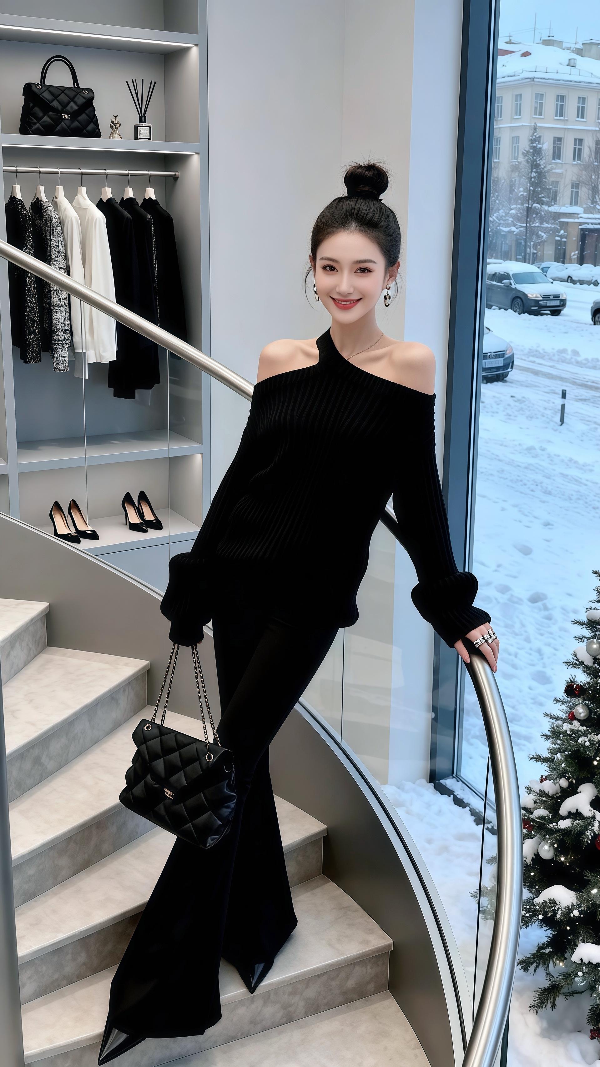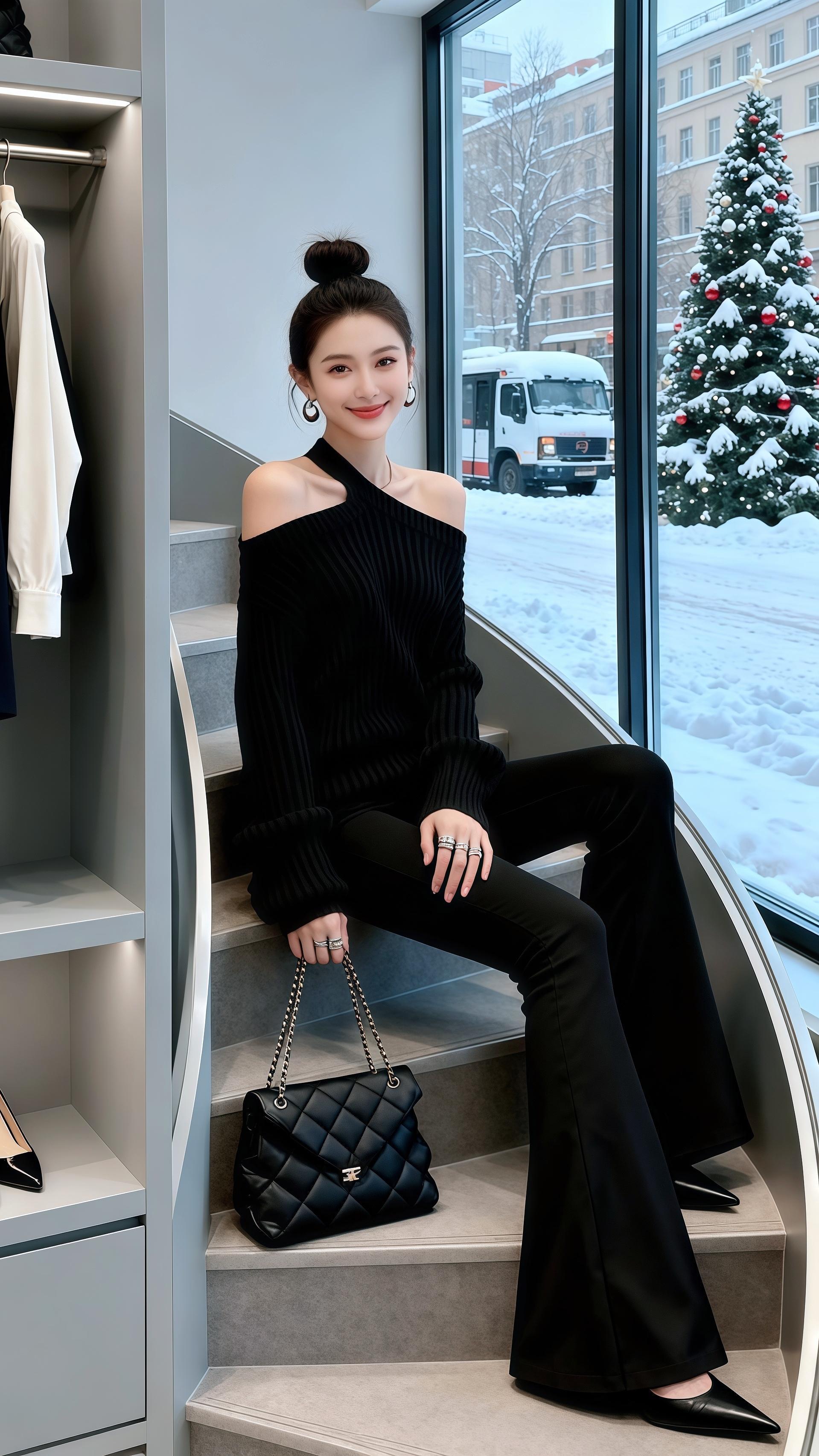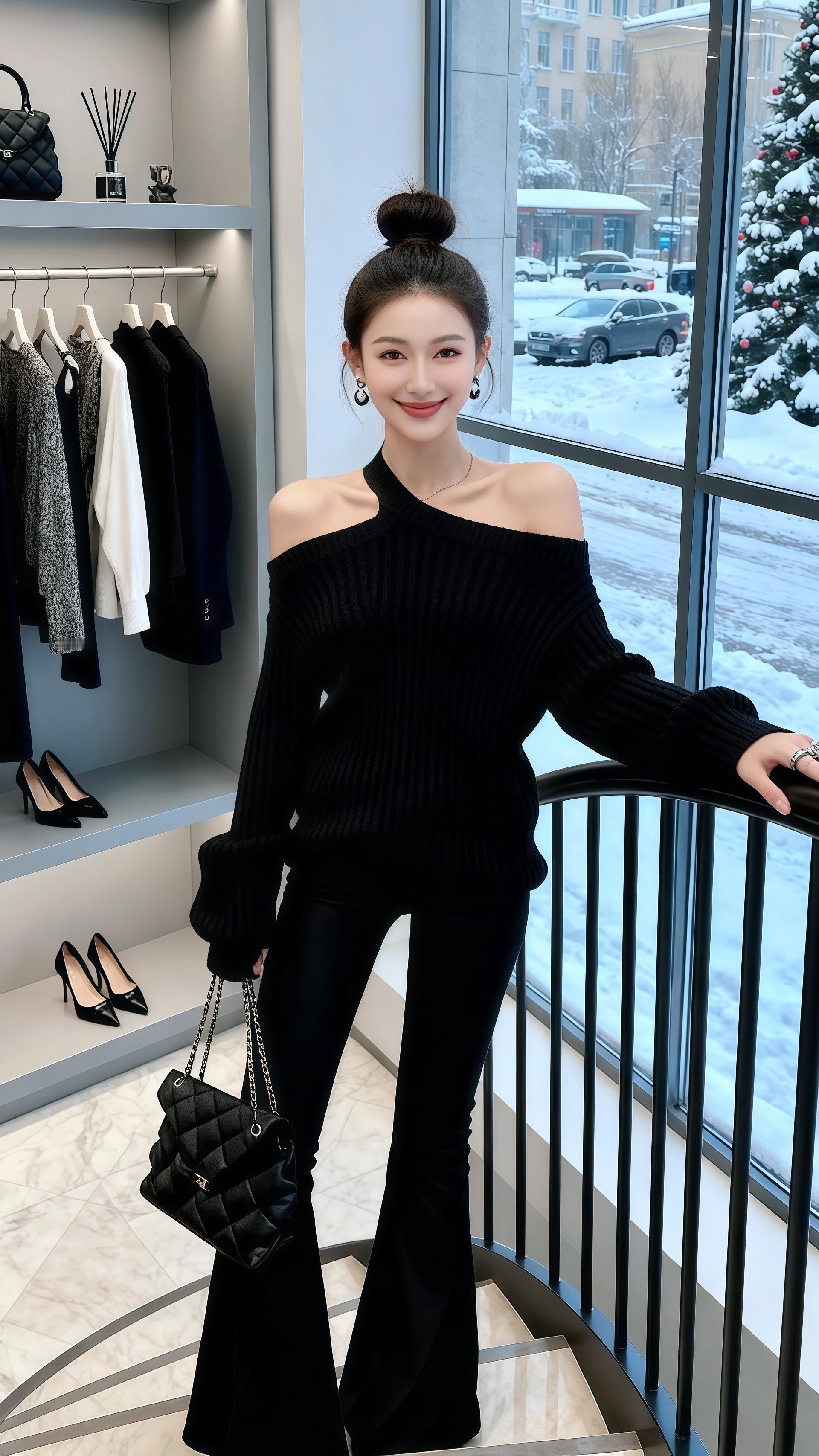 雪天里的酷飒黑系穿搭!许妍一身斜肩露肩毛衣小露性感,坑条纹理显质感,喇叭裤拉长腿型。菱格包与精致配饰加持,高丸子头利落吸睛,在暖奢空间与冰雪街景间,演绎冷艳又时髦的冬日风格。气质穿搭 今天穿什么 外穿内搭都好看 秋冬新款 秋冬穿搭