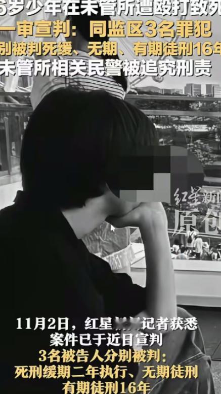 湖北武汉,未满16周岁的少年刘某某在服刑期间,遭到同监区狱霸殴打致死,狱霸称他直接殴打刘某某的次数很少,作用较轻,剩余二人则辩解称,他们受狱霸指使,是从犯,应该从轻处罚。近日,本案迎来宣判。 刘某某被送入未成年犯管教所的那天。他以为自己只是要接受纪律、学习和改造,以为自己还能有机会重新回到学校,回到母亲煮的一碗热汤面前。 进入监室的第一天下午,他便见到了后来的“狱霸”阮某。阮某虽同为未成年犯,但因为在监室时间长、体格壮,又敢动手,很快混成了“小头目”。 在监室里,他拥有一种近乎“土皇帝”般的地位。 刘某某被分到这个监室后,因为内务整理不达标、起床动作不够迅速,被骂、被踢。阮某并不把这些当“教育”,而是一种施压和宣示权力的手段。 “新来的,得懂规矩。” 这是阮某第一次对他说的话。 规矩是什么? 没有人说得清。但刘某某很快明白:规矩就是“听阮某的”。 第二天开始,体罚增多。 第三天,殴打升级。 第四天傍晚,他倒下了,昏迷不醒,最终抢救无效死亡。 一切来得太快,快得像有人用手掐灭一盏刚亮起的灯。 案件开庭那天,旁听席上的气氛如同压了一块沉重的石板。 阮某被带上法庭时,显得比案发时瘦了许多,但眼神里仍保留着几分嚣张。他低着头,但嘴角偶尔抽动,像是在压抑情绪。 法官询问他:“被告人阮某,你是否承认在管教所多次殴打刘某某?” 阮某抿了抿嘴,说:“我……我承认动手了,但我打得不多。真的不多。我就是推了几下,踢了一脚……他死不是因为我一个人的。” 法庭内有人忍不住发出压抑的惊呼。 阮某继续强调:“他们两个人(指夏某某、杨某某)也动手了。他们也打了。他死不能算我全责。” 说话时,他不敢抬头看刘某某的家人。 随后,夏某某和杨某某被带上来。他们明显紧张得更多,声音有些发颤。 夏某某说:“我们是被逼的……阮某让我们打,我们不敢不听。他骂我们,说不打就是对着干。他要是发火,我们都挨过打的。” 杨某某也跟着解释:“我打的时候轻……我没敢重手。都是他(指阮某)让我们打的。他是主犯,我们是从犯。我们应该从轻处罚……” 他们的解释反复围绕着一句话:“是阮某指使的,我们是从犯。” 无论主犯还是从犯,一个孩子的生命就这样被他们三人间接推向了深渊。 庭审休息时段,刘母靠在墙角,整个人像快要滑落。她捧着孩子的照片,眼泪不受控制地落下来,滴在照片上。 “我儿子才十五岁……” “他进去的时候还跟我说会改……怎么就没了……” 旁边一位亲戚扶着她,喉咙也发紧。父亲则沉默得可怕,眼睛一瞬不瞬地盯着地面。 有人试着和他说话:“节哀……会有公道的。” 父亲终于抬起头,眼睛布满血丝:“公道?他们说打得少,就是轻吗?他们说是从犯,就能轻点?那我儿子呢?我儿子怎么轻轻地就没了?” 他的声音不大,却像钉子一样扎在每个人耳朵里。 下午两点,审判长正式宣读判决。 随着法槌落下,空气骤然凝固。 阮某:故意伤害罪、破坏监管秩序罪——死刑缓期两年执行。 夏某某:无期徒刑。 杨某某:有期徒刑 16 年。 他们三人需共同承担赔偿责任。 宣判一瞬间,刘母的腿软得差点站不住。父亲扶住她,一句话没说,但轻轻点了一下头。 他知道,这不是“结束”,也不是“慰藉”。 只是一个无可挽回的结果被正式写进了纸上。 “至少……至少他们得到了惩罚。” 他说这句话时,声音像被锋利的刀刮过。 案件公布后,网络上掀起更大的讨论。 有愤怒的: “这群人在监狱里都改不好,还欺负比自己更弱的孩子?” 有质问的: “监管制度是谁在监督?监室里的暴力为什么能持续发生?” 也有理性的: “未成年犯本就脆弱,制度应当保护,而不是让他们在另一个暴力循环里继续受伤。” 更多的是心疼: “刘某某犯过错,但不该被打死。孩子死在教育他的地方,这是整个系统的悲哀。”