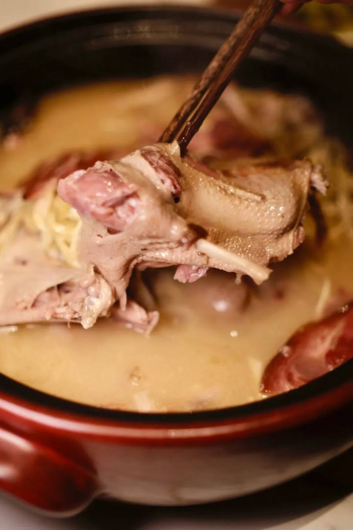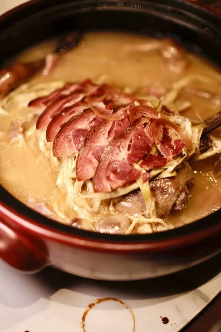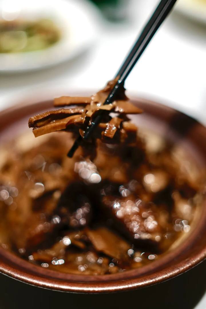 笋丝老鸭煲,鸭子用的是养在海边吃鱼虾长大的鸭,这是朱德明不久前去舟山找回来的。笋则各地都有,有无多大分别?旁人不晓,杭州人懂,以临安笋最佳。