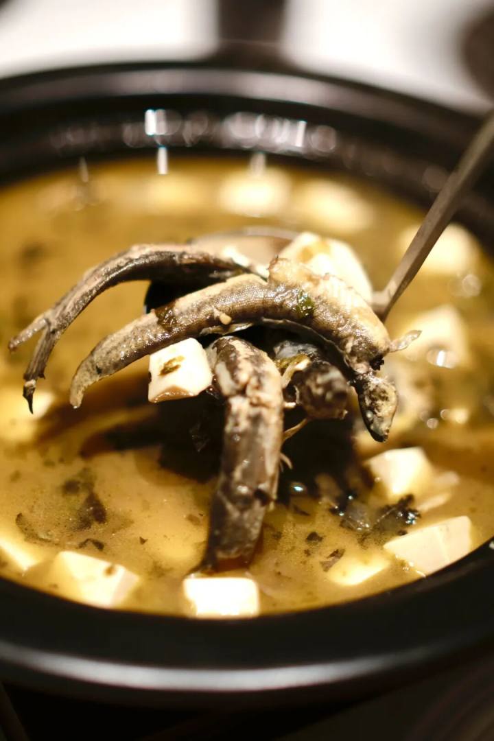 “我奶奶是龙泉人,紫苏腌制过,烧汤,是龙泉的烧法。再放豆腐泥鳅。泥鳅买回来养半个月,肚子里脏东西吐净,不剖,不去内脏,整条烧,这么吃。”朱海频介绍。