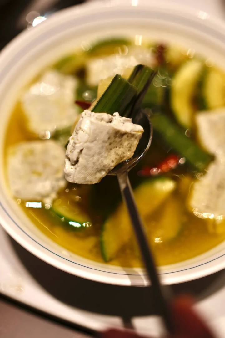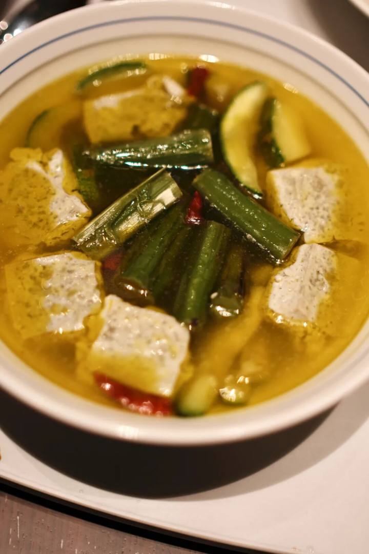 上面是发酵霉物,汤底是新鲜嫩南瓜,有长辈提携晚辈之意。