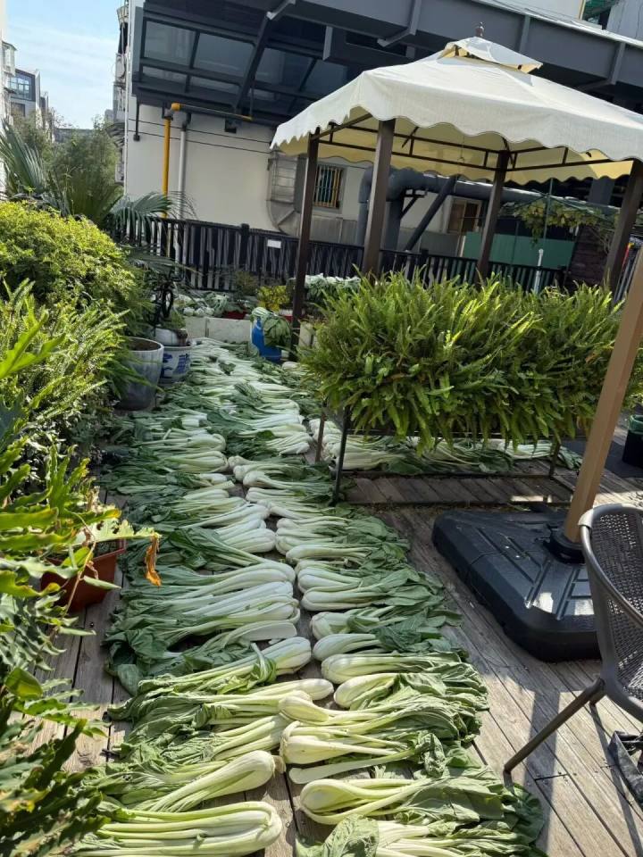 德明家的冬腌菜,每年照旧自己做,经霜的长梗白菜就晒在八卦新村老店。楼上有屋顶花园,太阳大,则曝晒一天半即可。