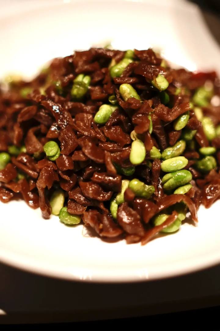 萝卜干炒毛豆,经典萧山菜,萝卜干切丁,抓洗去咸,毛豆焯水,保持翠绿,黄绿相间,咸鲜脆爽,下酒隽物。