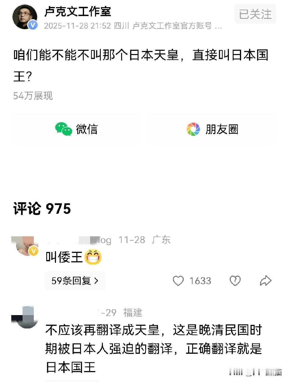 卢克文的这个提议说到点子上了! 日本“天皇”的那个称谓,其实是不存在的,在汉朝的时候称日本的王为倭奴王,在此后的朝代包括清朝都是直接称呼为日本国王,哪来的蹦出一个“天皇”?小小的日本怎么能承受得起高出一等的称呼! 咱们这边的正式文件该改的一定要改,这不仅仅是一个称呼的问题,这是法理上的地位问题。
