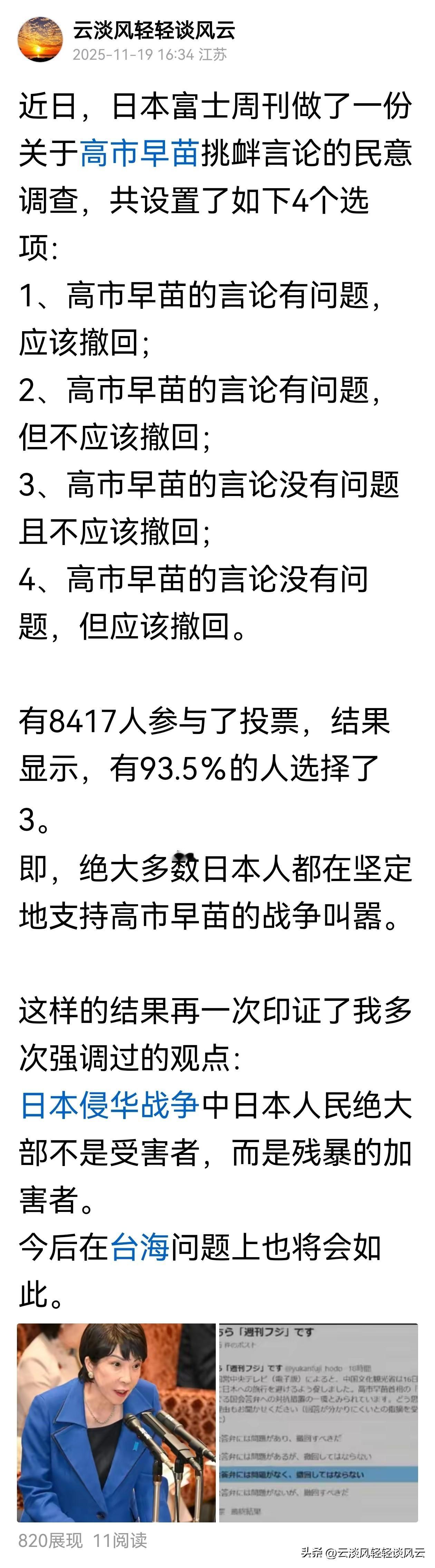 这充分暴露了所谓“也是二战受害者”的日本人民的真实嘴脸 此人的行为只是一个“点”,而日本国内的民调显示有超过70-80%甚至以上的所谓日本人民支持高市早苗的挑衅言论和战争叫嚣,这体现了日本军国主义支持者的整个“面”的广。 他们绝不是战受害者,而是军国主义的帮凶和助纣为虐者,是军国主义复活的土壤。 我们千万不要再天真了,对于凶残的侵略者千万不要太善良了。