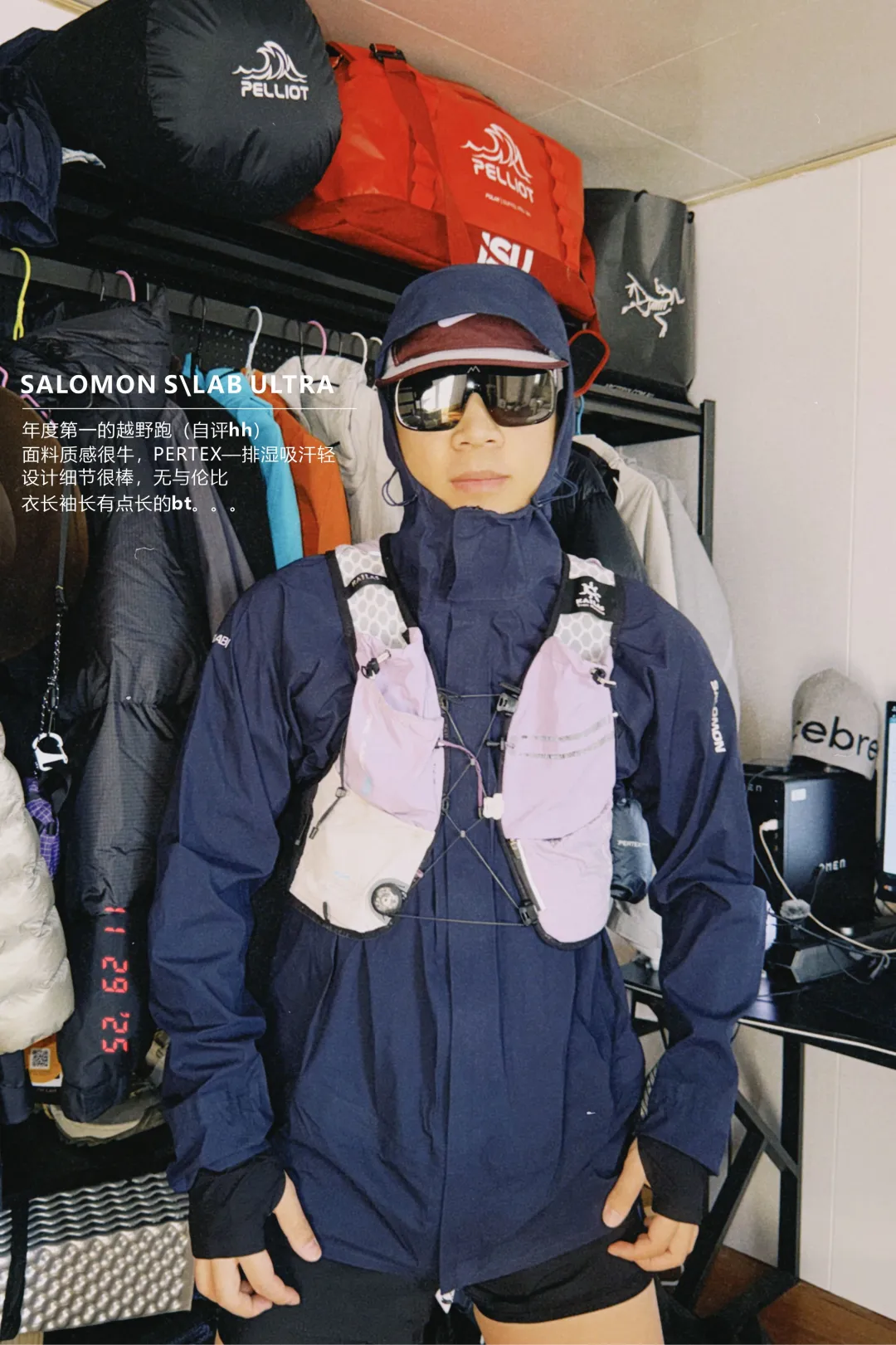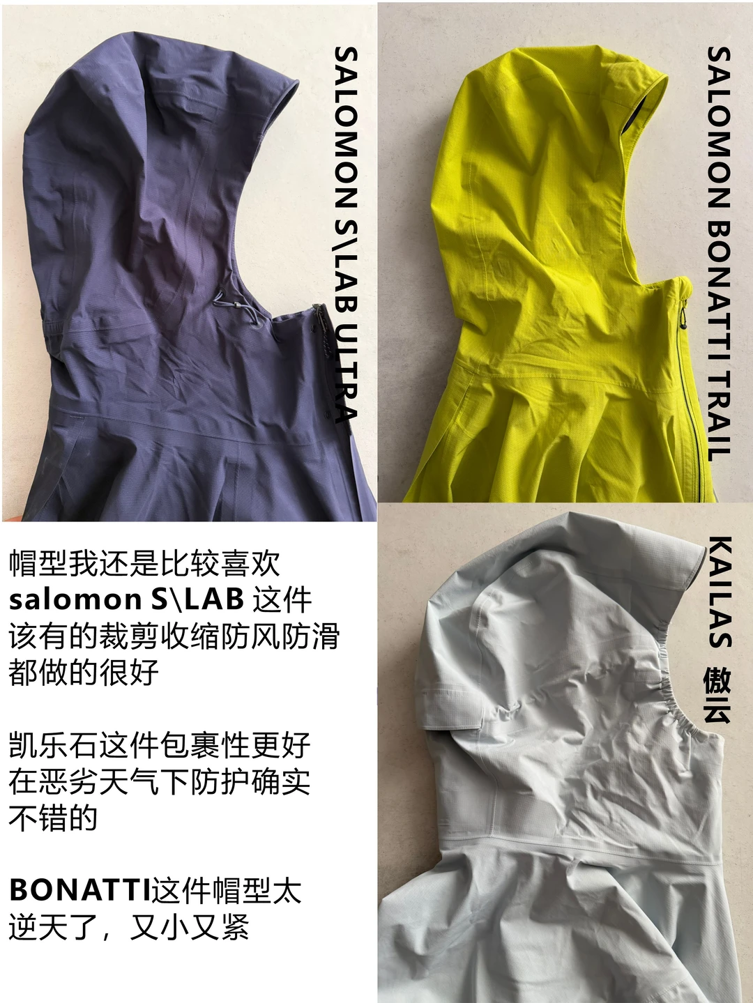 SALOMON S\LAB ULTRA :目前最惊艳我的越野跑冲锋衣,所有的细节都为了赋能越野跑。Pertex的面料很吸汗,很柔和舒服。帽子做了一个固化的设计,让帽子可以贴合你的头部摆动,整件衣服只有后面有个口袋用来收纳用,后中同样设计了可容纳越野包的设计,袖子有针织的袖口设计,装备赋能运动的具体呈现