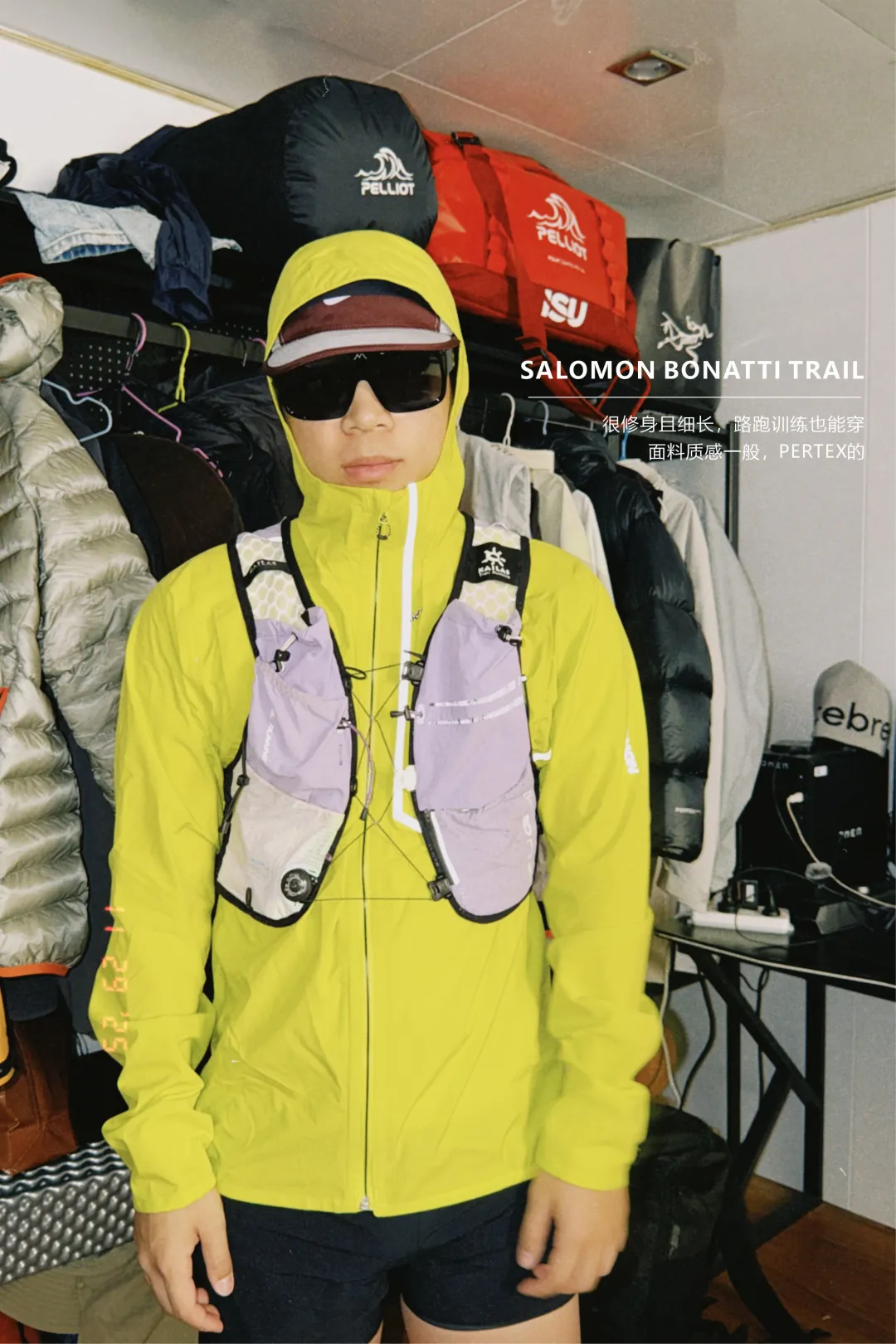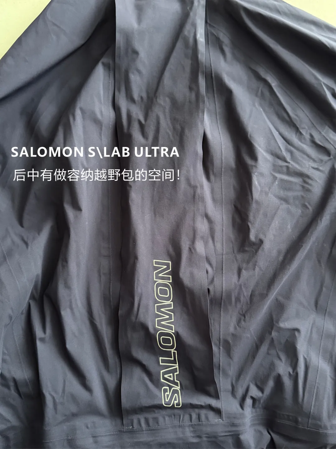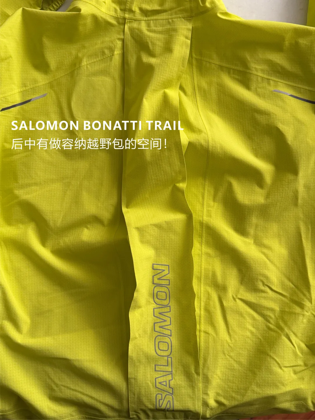 SALOMON BONATTI TRAIL:质感很像风壳,帽子有赋能戴帽的设计,前中的标志性口袋也很经典,里面还能直接饮水使用。最重要的是面料很轻薄,感觉就像两层结构一样轻薄(难道这也是2.5层?)整件衣服也压胶了,后中有一个很好的设计,可以直接容纳越野跑的背负