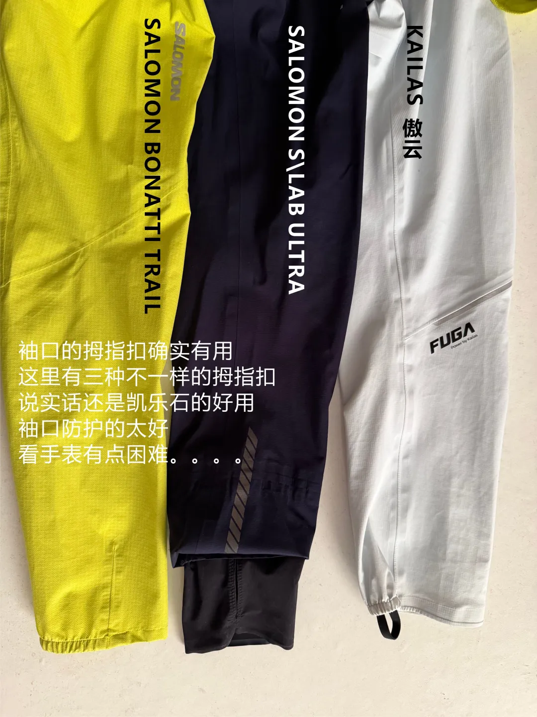 先从裁剪来说,基本专业的越野跑品牌的冲锋衣,比如凯乐石的FUGA HOKA SALOMON这种品牌,裁剪的工艺是很精湛的,要有必要的细节之外,还要赋能你的运动节奏,比如长袖子、合适的风帽、以及每个口袋的位置都很有讲究