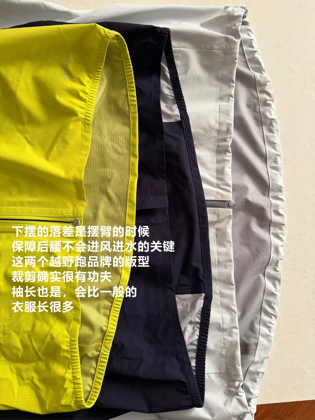 其次最重要的是透气,越野跑核心就是:你会不断升温、大汗、冷却再升温,膜排的是水蒸气。如果你底层衣物不吸汗,汗成了一层水膜——再好的透气膜都没用。这就是为什么透气性永远是系统性的:底层排汗、中层不能闷、外层 DWR 要好,所以选越野跑冲锋衣可以关注一下层数结构: